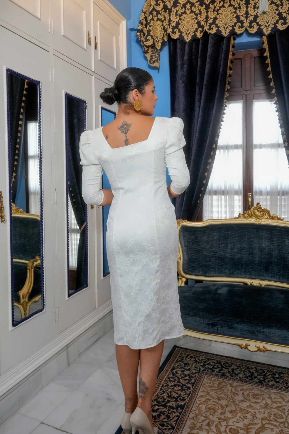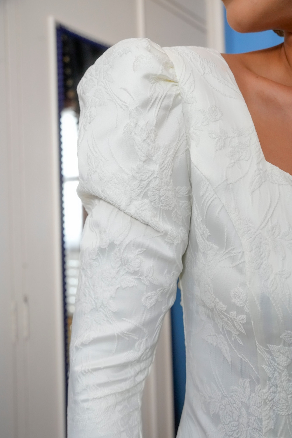 Vestido Anhelo marfil camisero brocado liso con manga francesa jamón y escote corazón Káhyra. COMPOSICIÓN: 100% POLIAMIDA