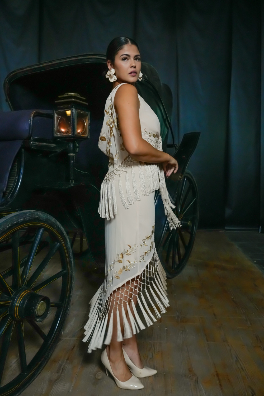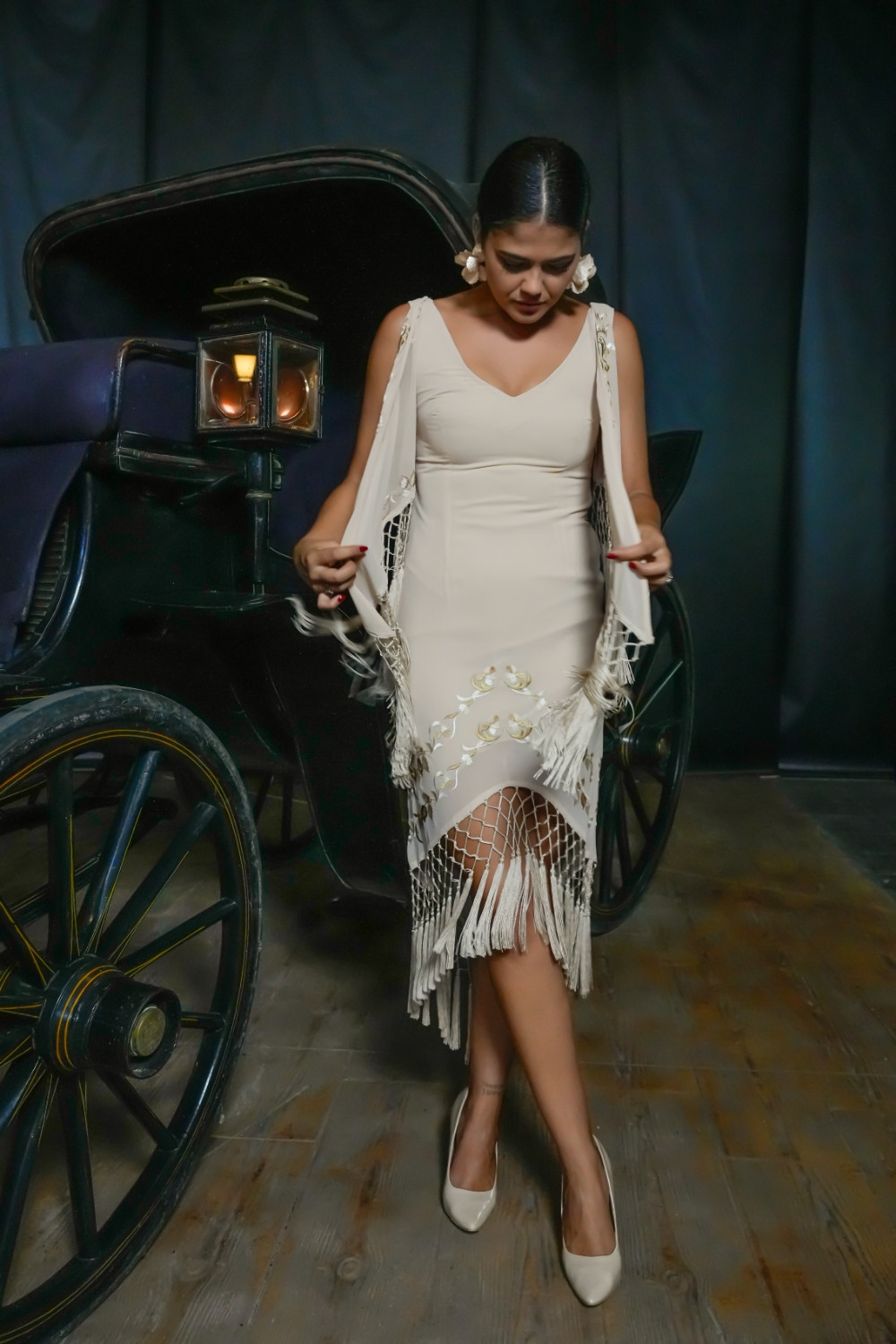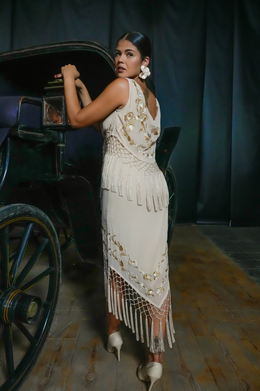 Vestido Soledad Beige de gasa bordada al tono. sin mangas y efecto mantón anudado en el pecho Káhyra