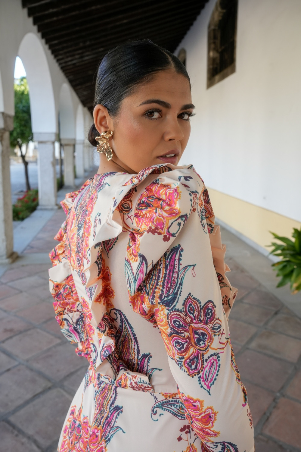 Vestido Triana beige estampado flores y cashimir . manga francesa abullonadas. con volante en costadillo delantero y trasero Káhyra. COMPOSICIÓN: 100%POLIÉSTER FORRO: 100%POLIÉSTER