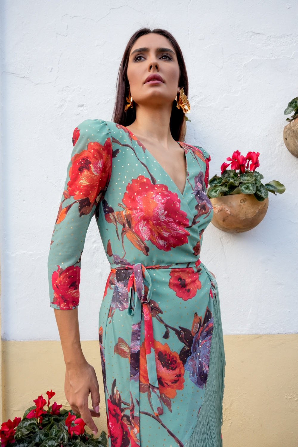 Referencia: V2642BVestido Macarena en gasa Verde estampada con flores multicolor tonos corales y morados. moteado sutil de puntitos dorados. cruzado manga francesa .doble fila flecos a tono Káhyra.