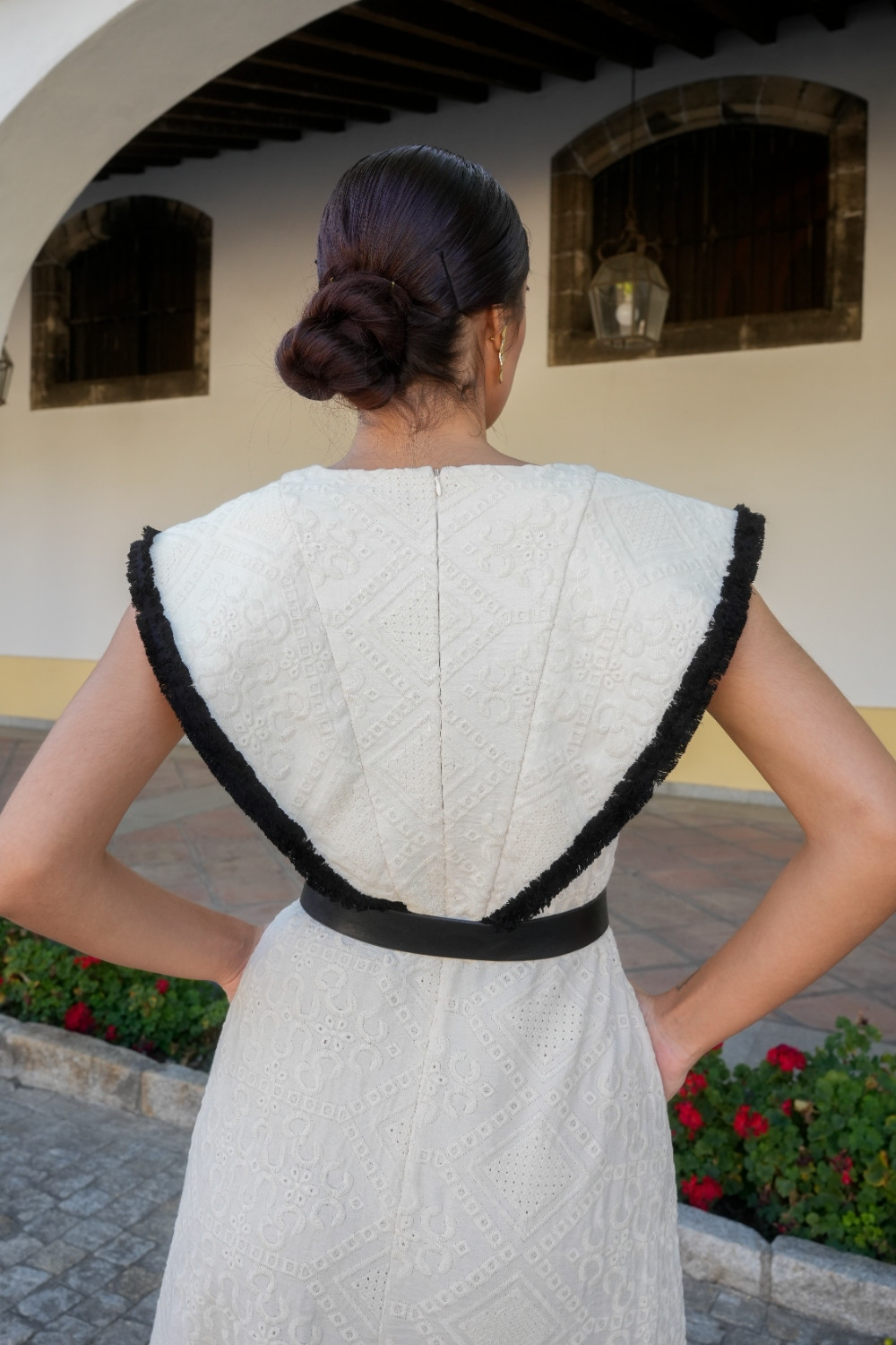 Vestido Lozanía beige enrejado bordado en beige . con volantes hombros y bajo y pasamanería flecos negros Káhyra. COMPOSICIÓN: 50%ALGODON.50%POLIÉSTER ACCESORIOS: FLECOS-100%POLIÉSTER