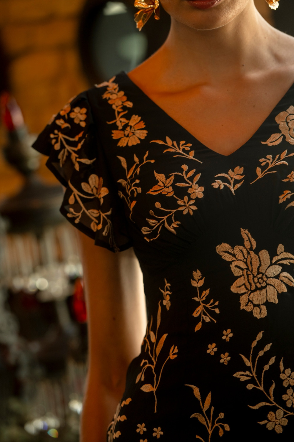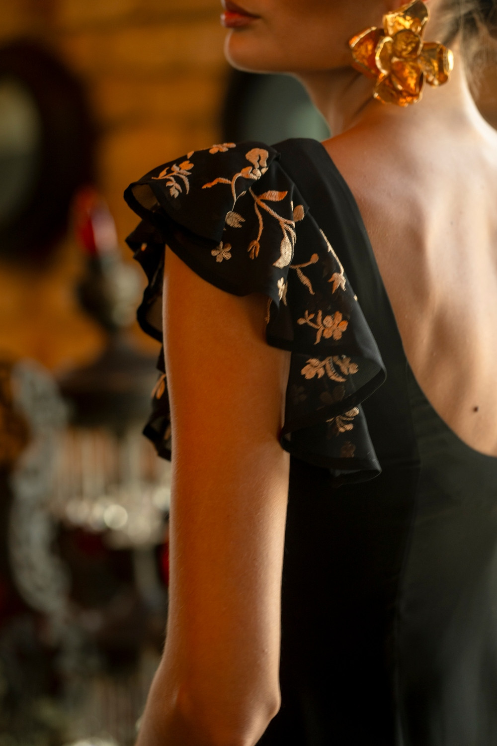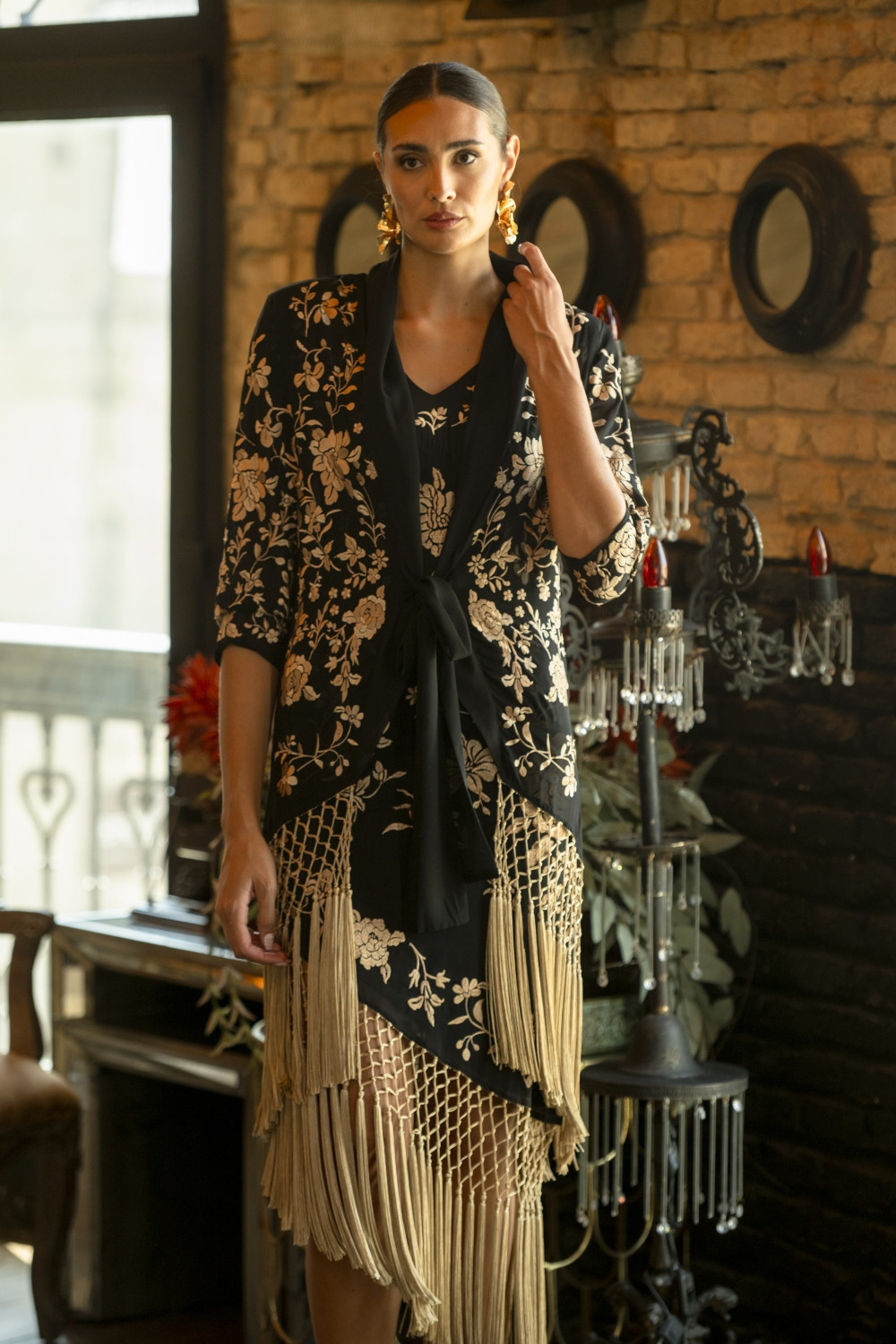 Vestido Jazmín negro de gasa sin manga con un volante sutil a la sisa. bordado en beige dorado terminado en el bajo asimétrico con flecos de mantón al tono del bordado Káhyra. COMPOSICIÓN: 100% POLIÉSTER FORRO: 100% POLIÉSTER ACCESORIOS: FLECOS 100% VISCOSA