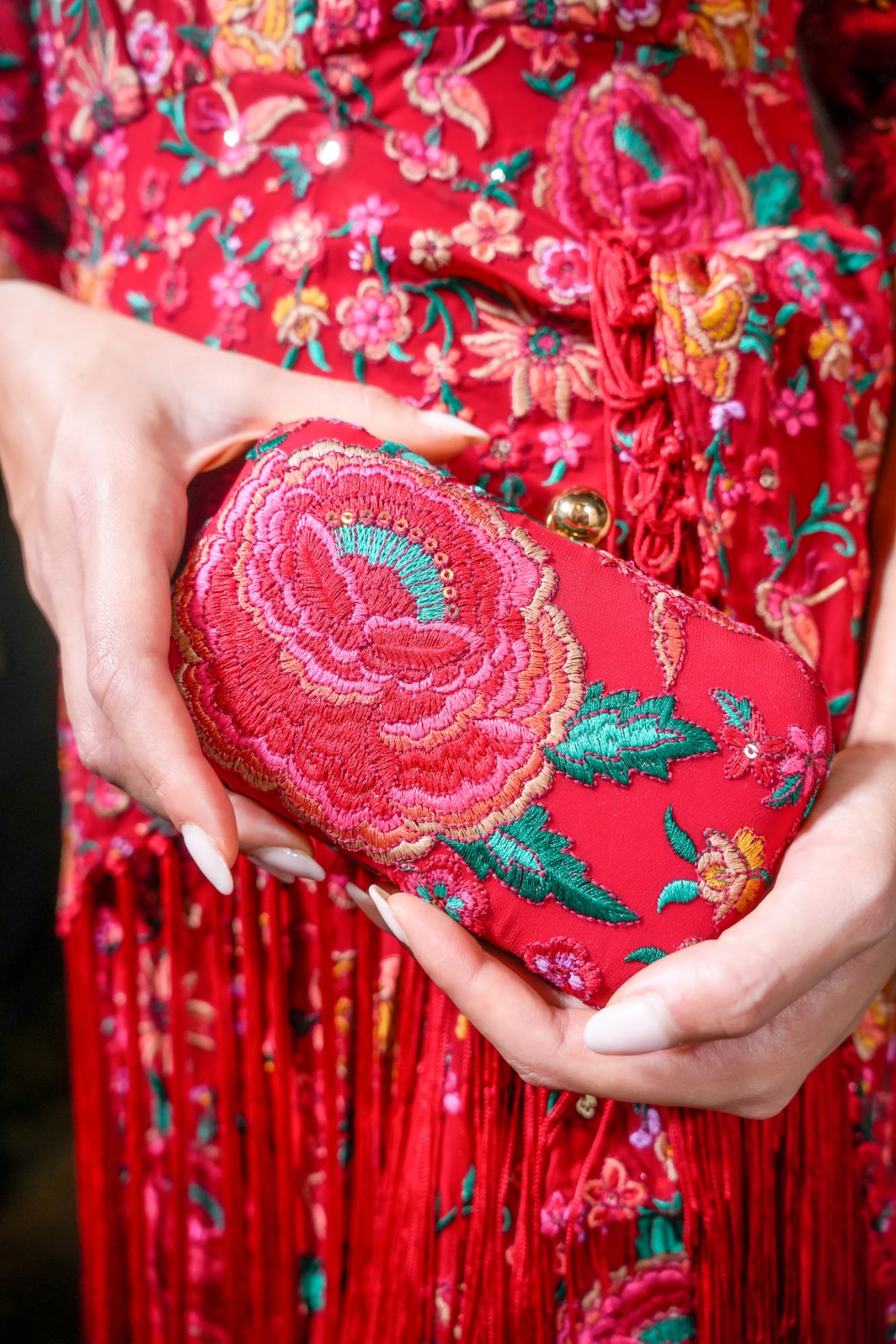 Vestido Feria rojo de tejido de gasa bordado con flores en tonos rojo, fucsia y coral de media manga, escote en v y fajín mantoncillo anudado en la cintura Káhyra.