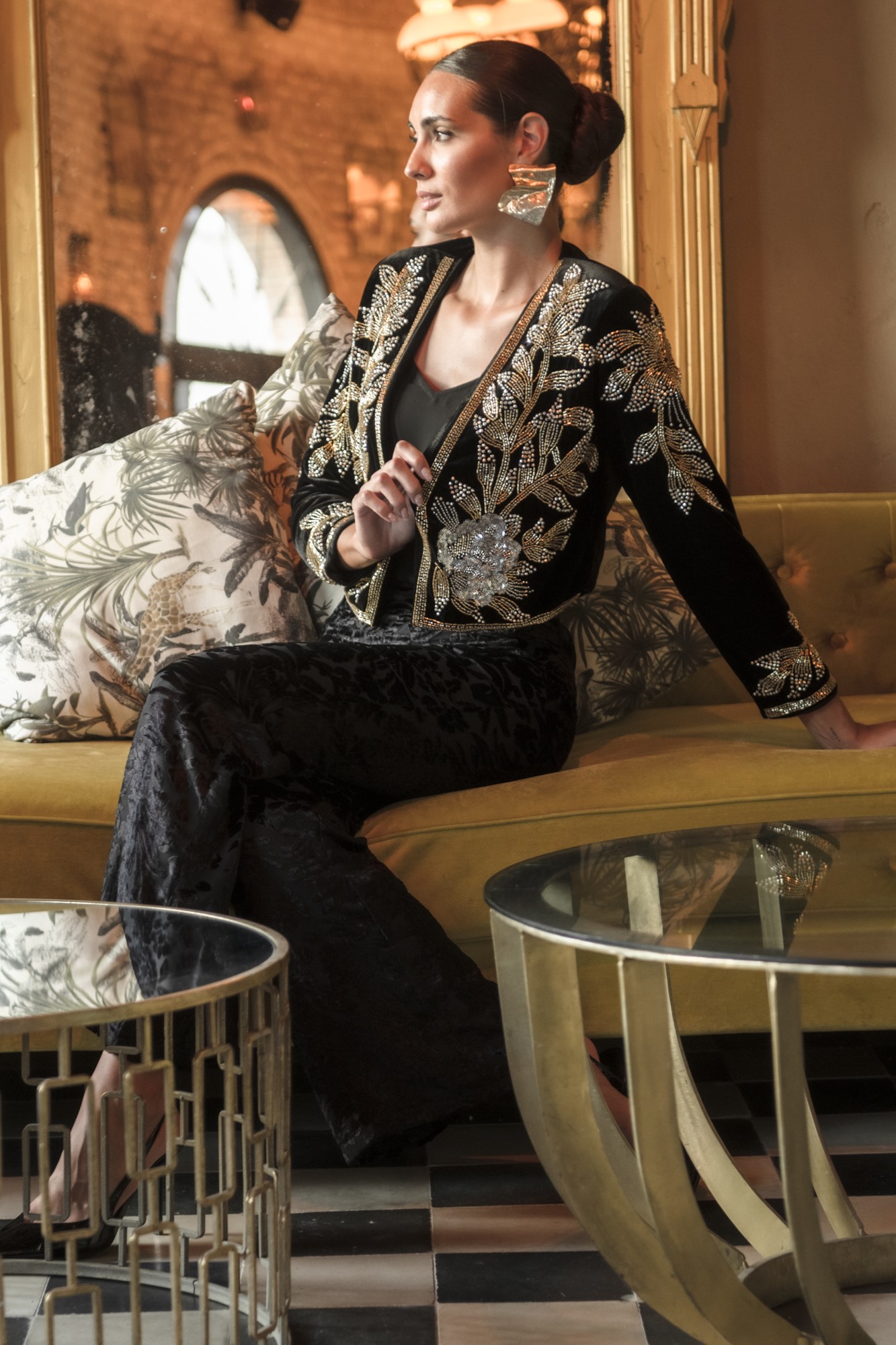 Chaqueta beige bordada a tono con flores mantón y flecos enrejados en filo y manga.Calidad: 100% Poliéster - Flecos: 100% Viscosa