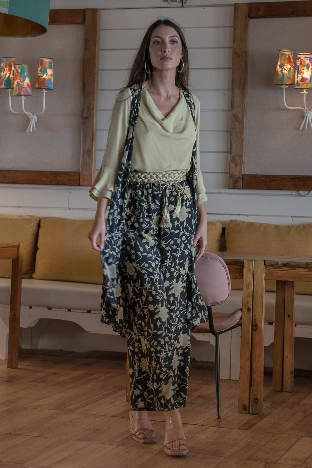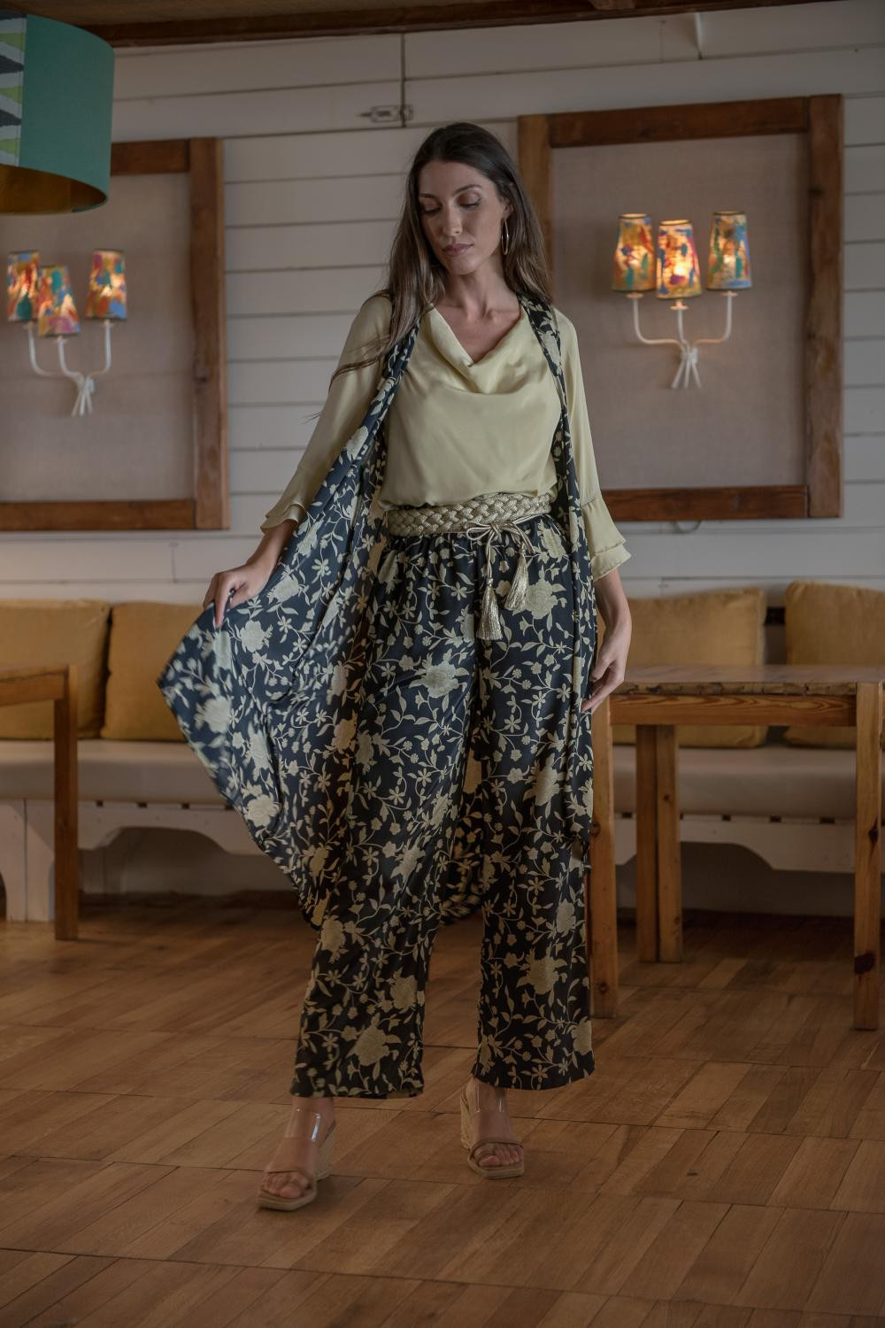 Pantalón fruncido cintura negro con flores MantónCOMPOSICIÓN: 70% POLIESTER 30% SEDA