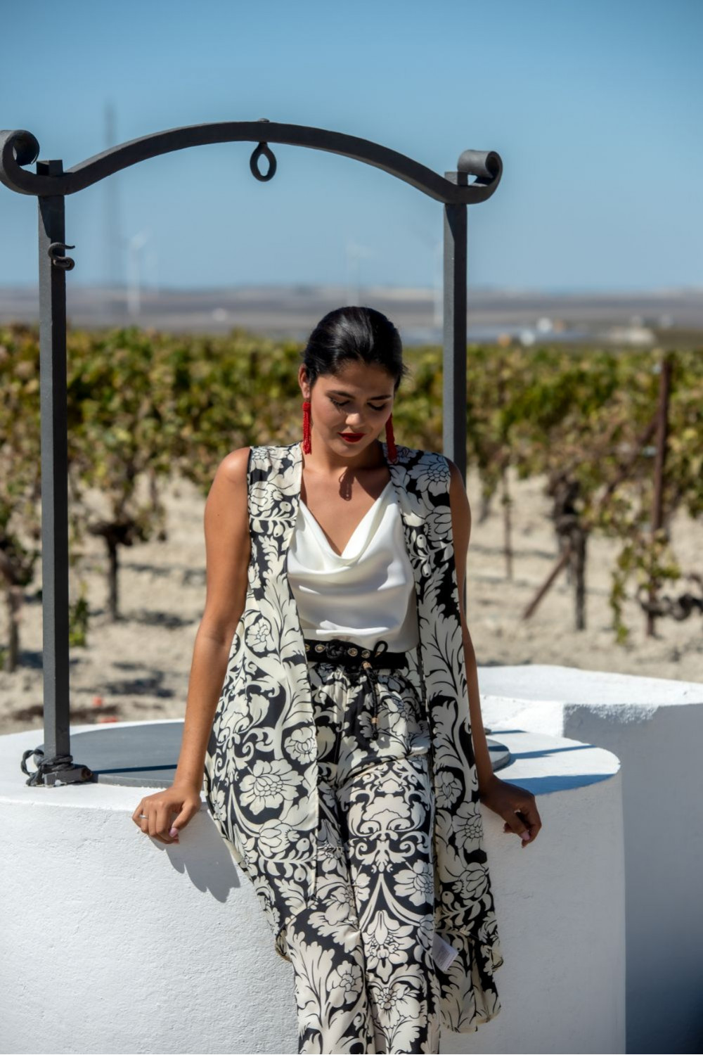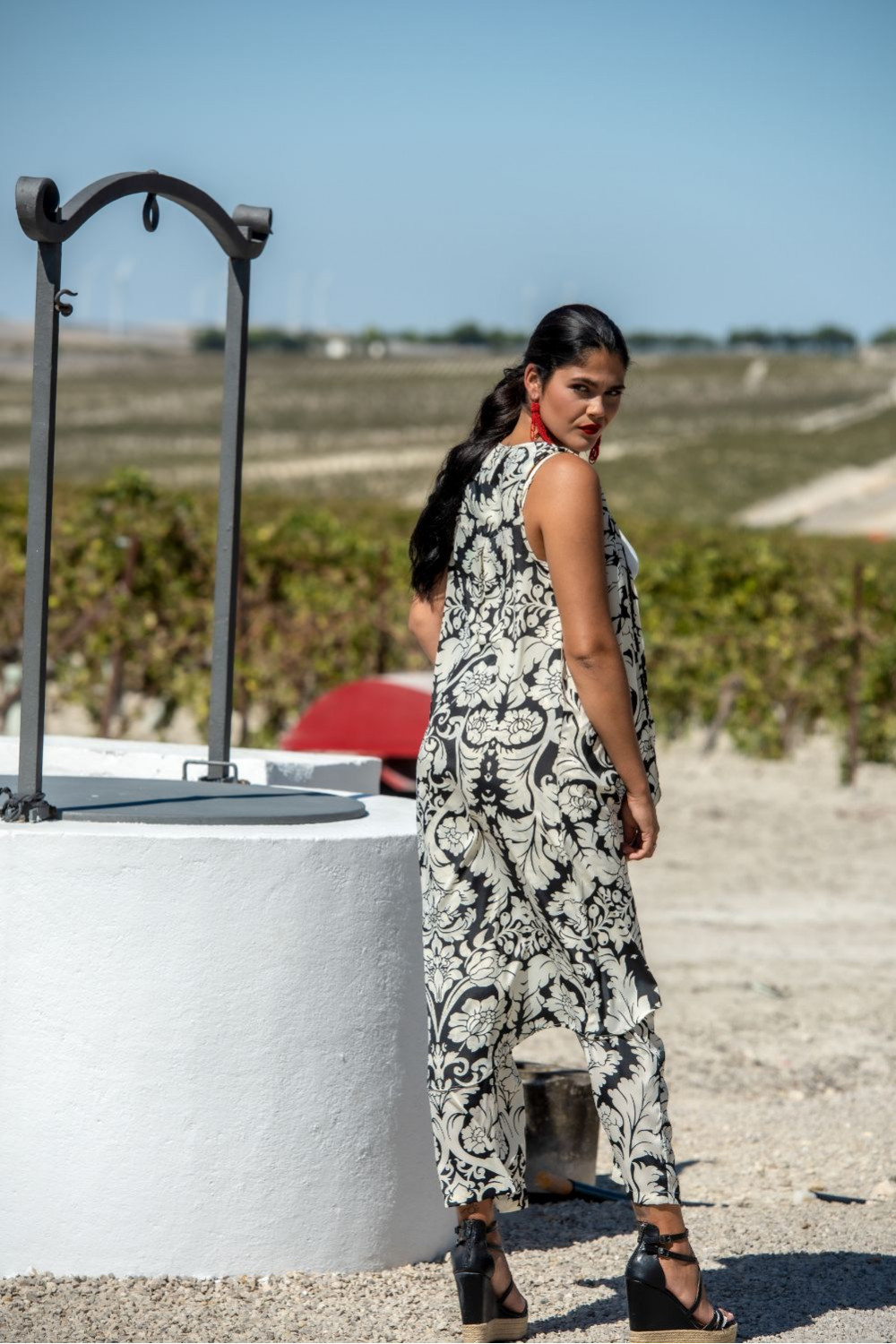 Chaleco sin manga almijar de polysilk con motivos ornamentales bicolor en beige y negro.