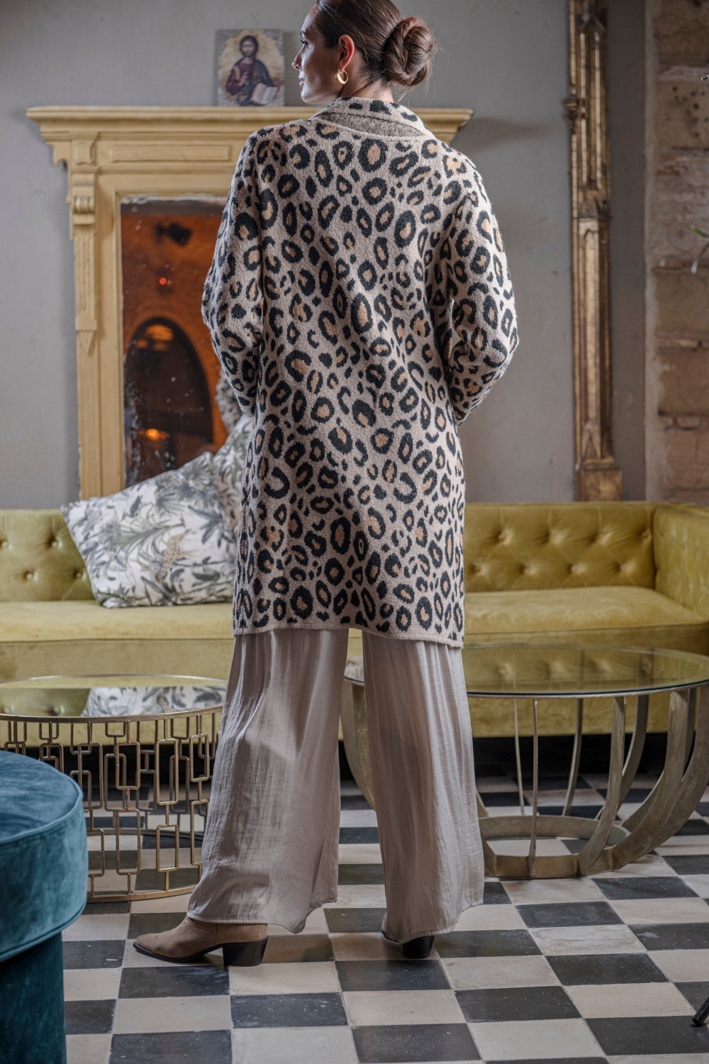 Abrigo Animal beige en estampado de leopardo solapa en el cuello y maxi bolsillos cuadrados CALIDAD: 75 % ACRILICO. 22 % POLYESTER. 3 % SPANDEX