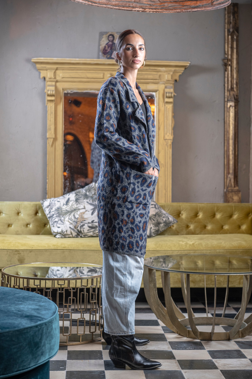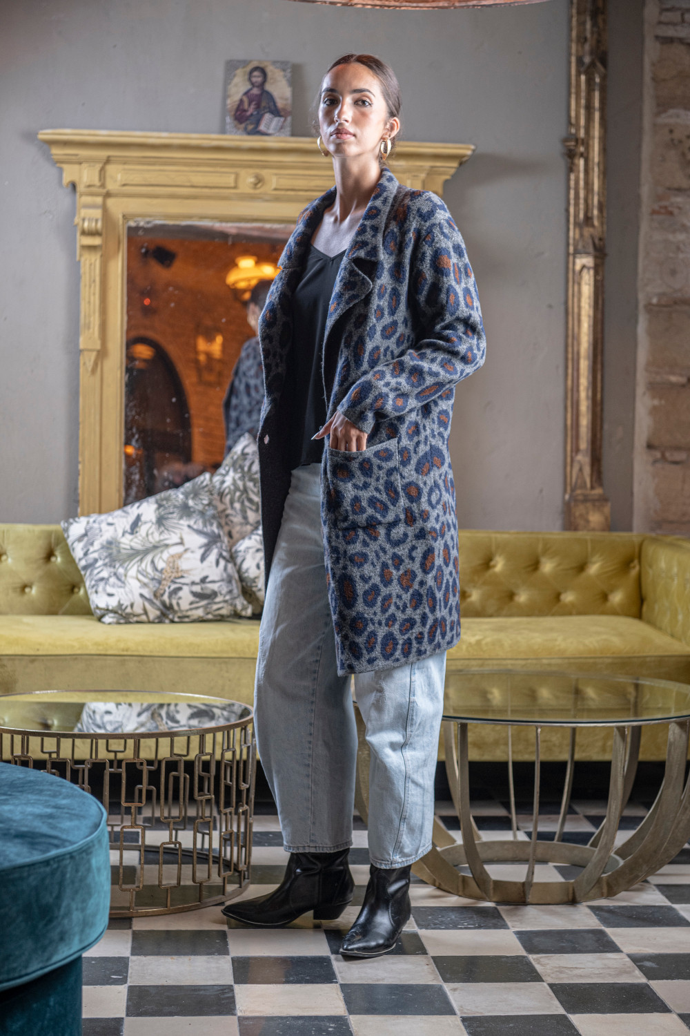 Abrigo Animal gris en estampado de leopardo solapa en el cuello y maxi bolsillo cuadrados CALIDAD: 75 % ACRILICO. 22 % POLYESTER. 3 % SPANDEX