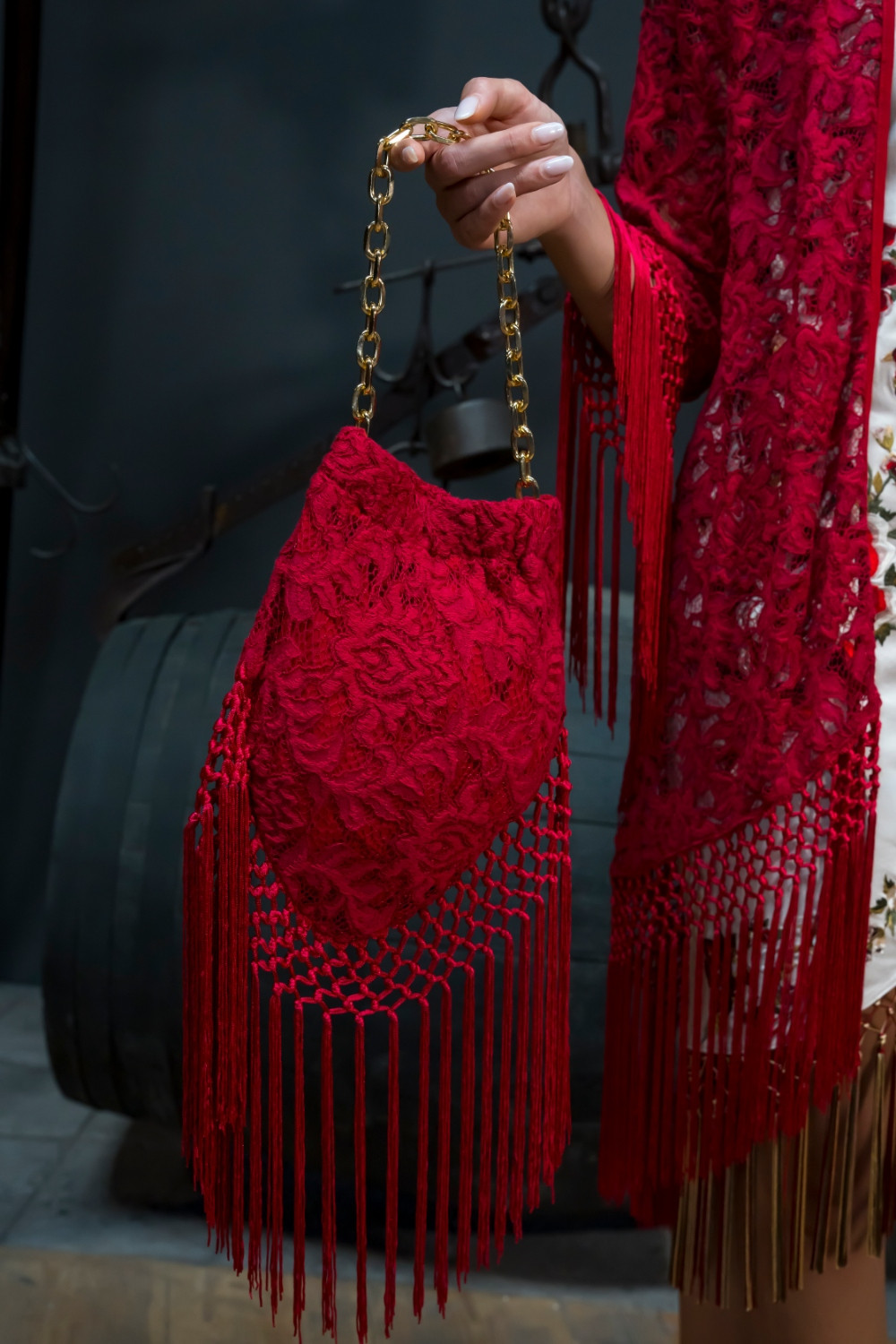 Bolso Saeta rojo limosnera de encaje con flecos al tono kahyra
