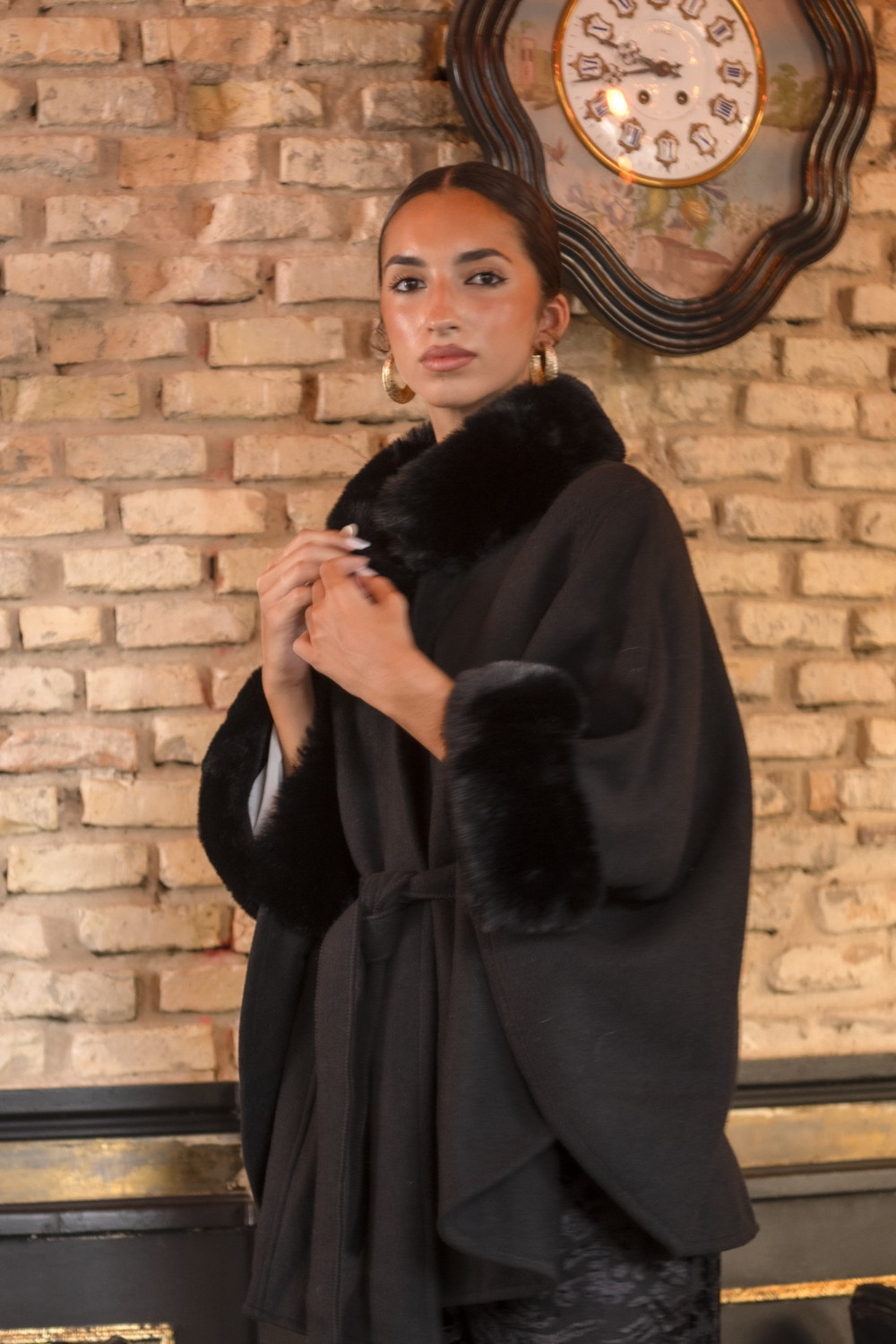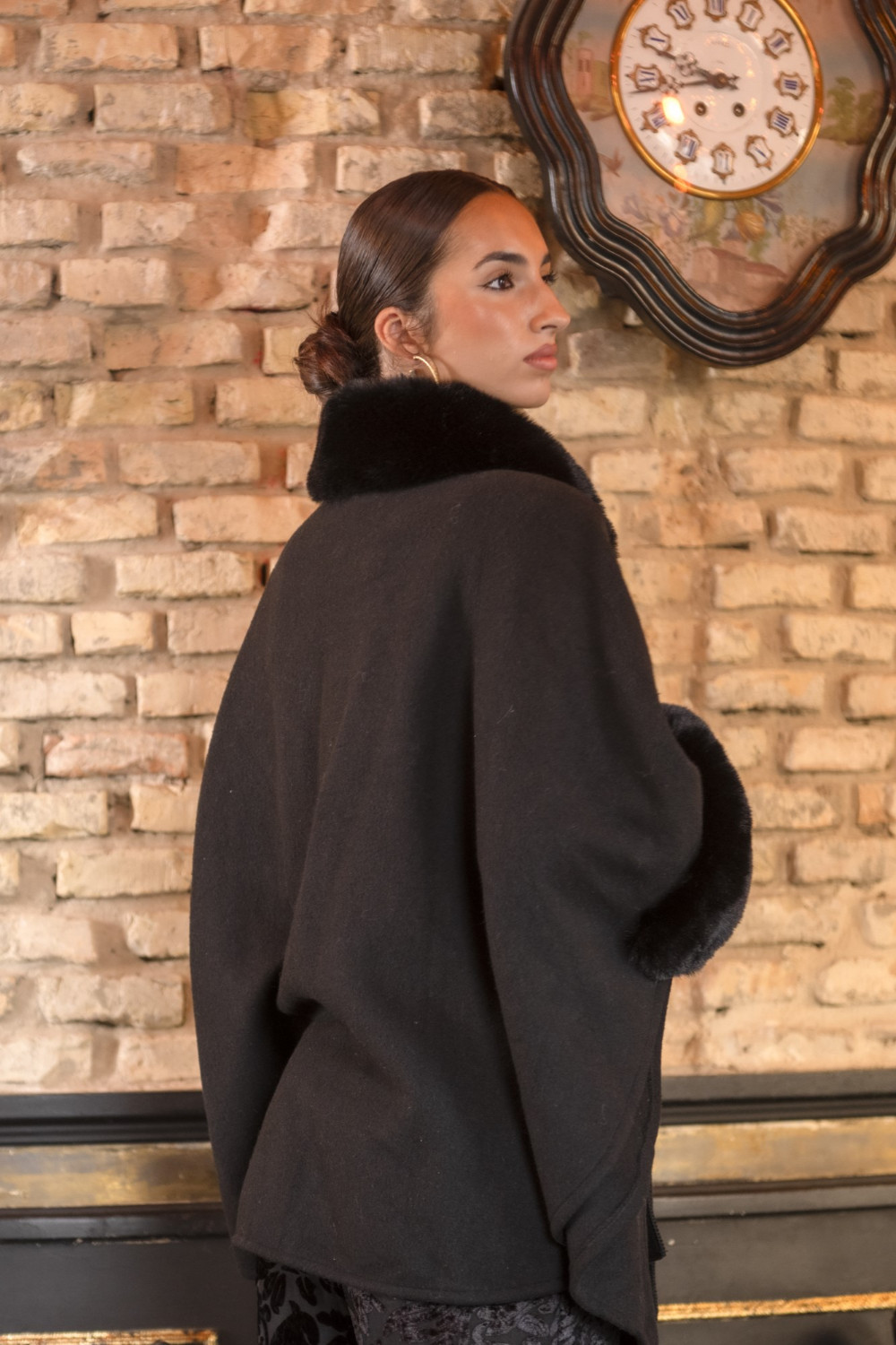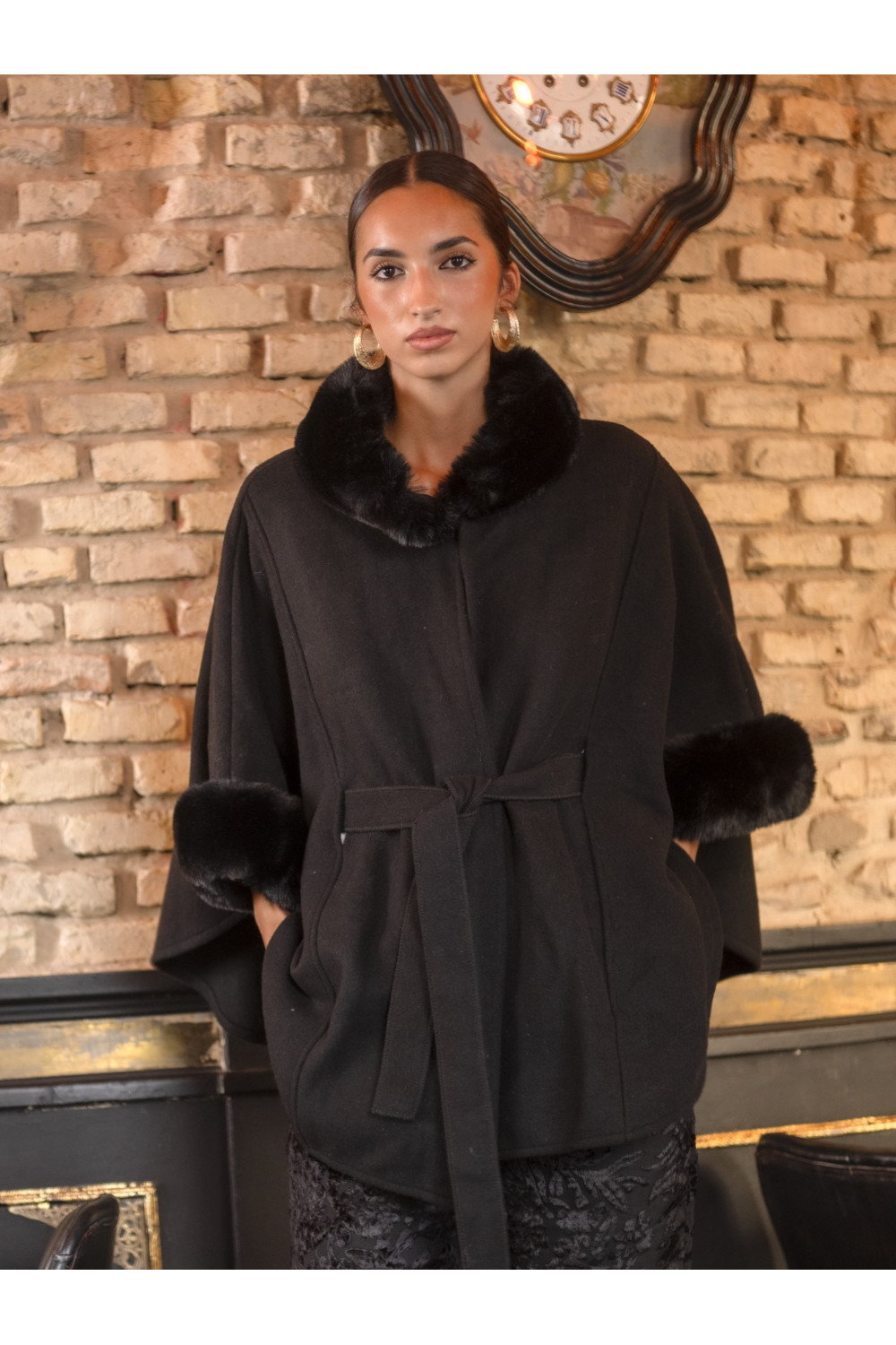 Capa Macis de paño negro con pelo al tono en el cuello. filo de la manga CALIDAD: 100 % POLYESTER