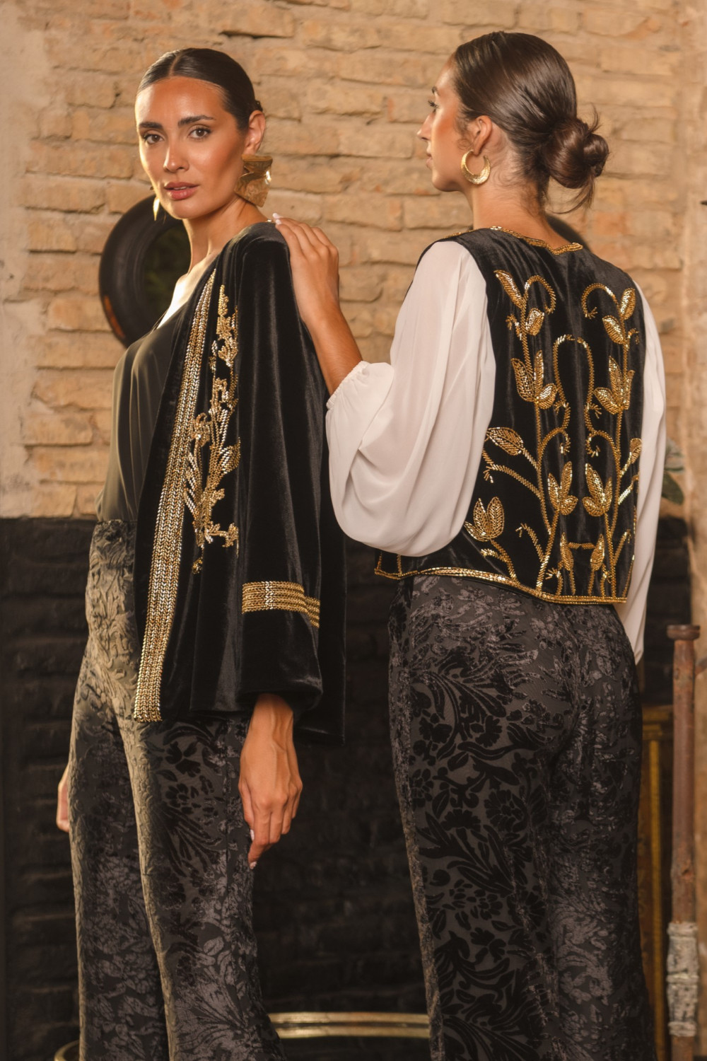 Chaleco Romero de terciopelo negro con apliques de pedrería oro CALIDAD: 92 % POLYESTER 8 % SPANDEX