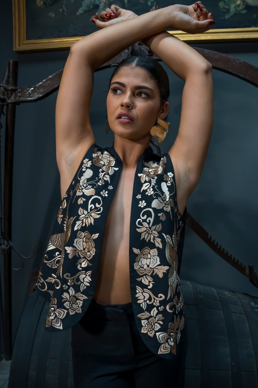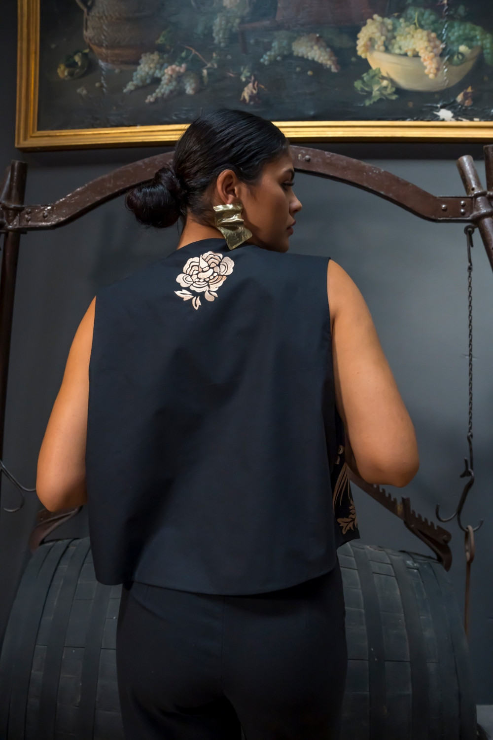 Chaleco Manila negro bordado como mantón en hilos beige dorados Kahyra. COMPOSICIÓN: 100% ALGODÓN