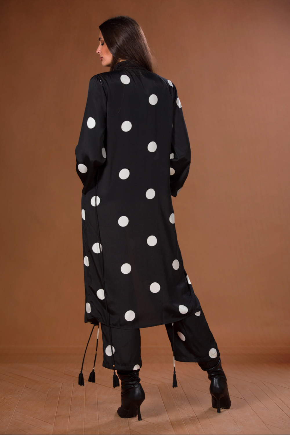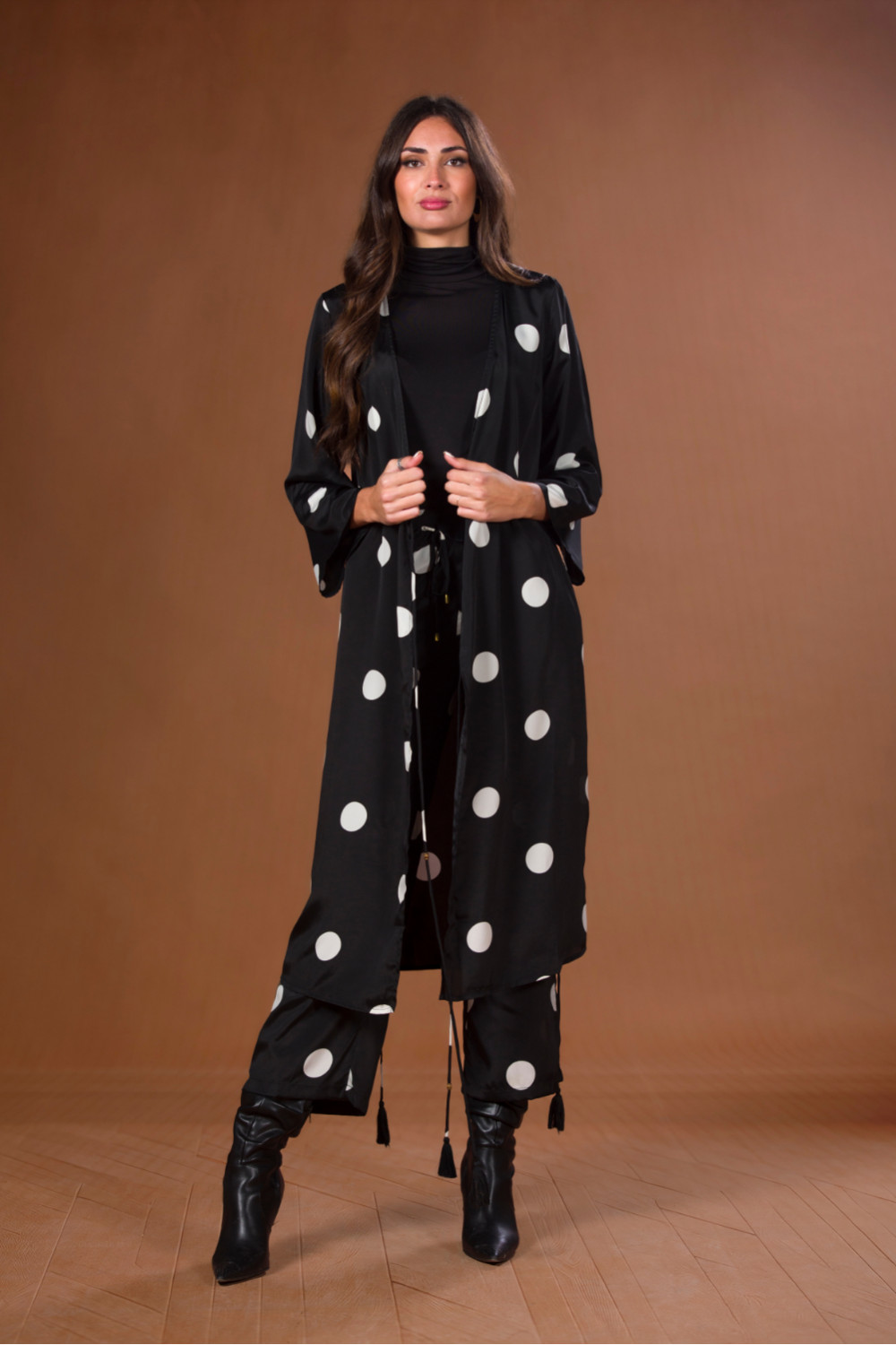 Chaqueta luna de satén en negro con lunares blancos tipo caftán de manga larga.