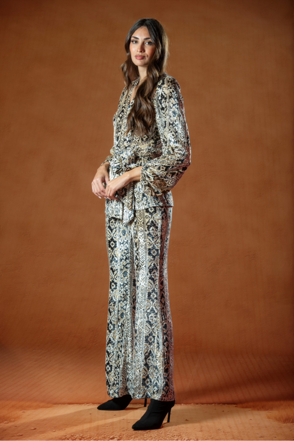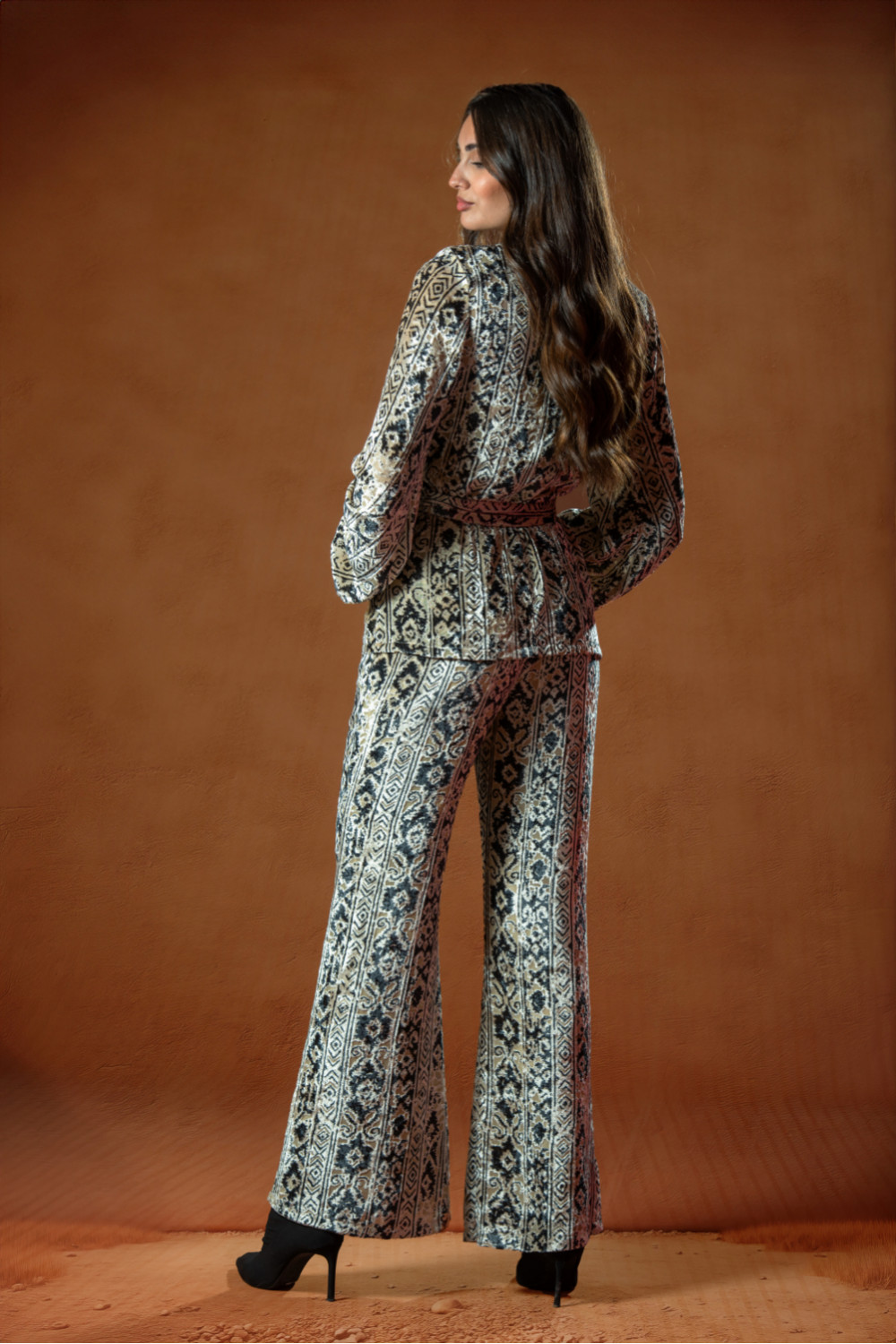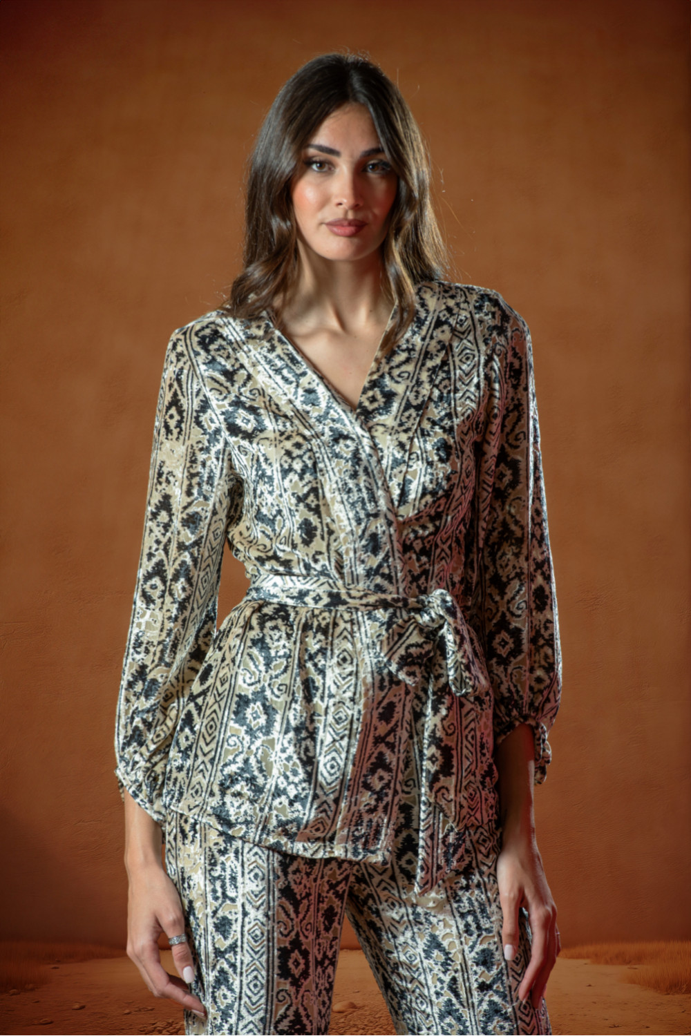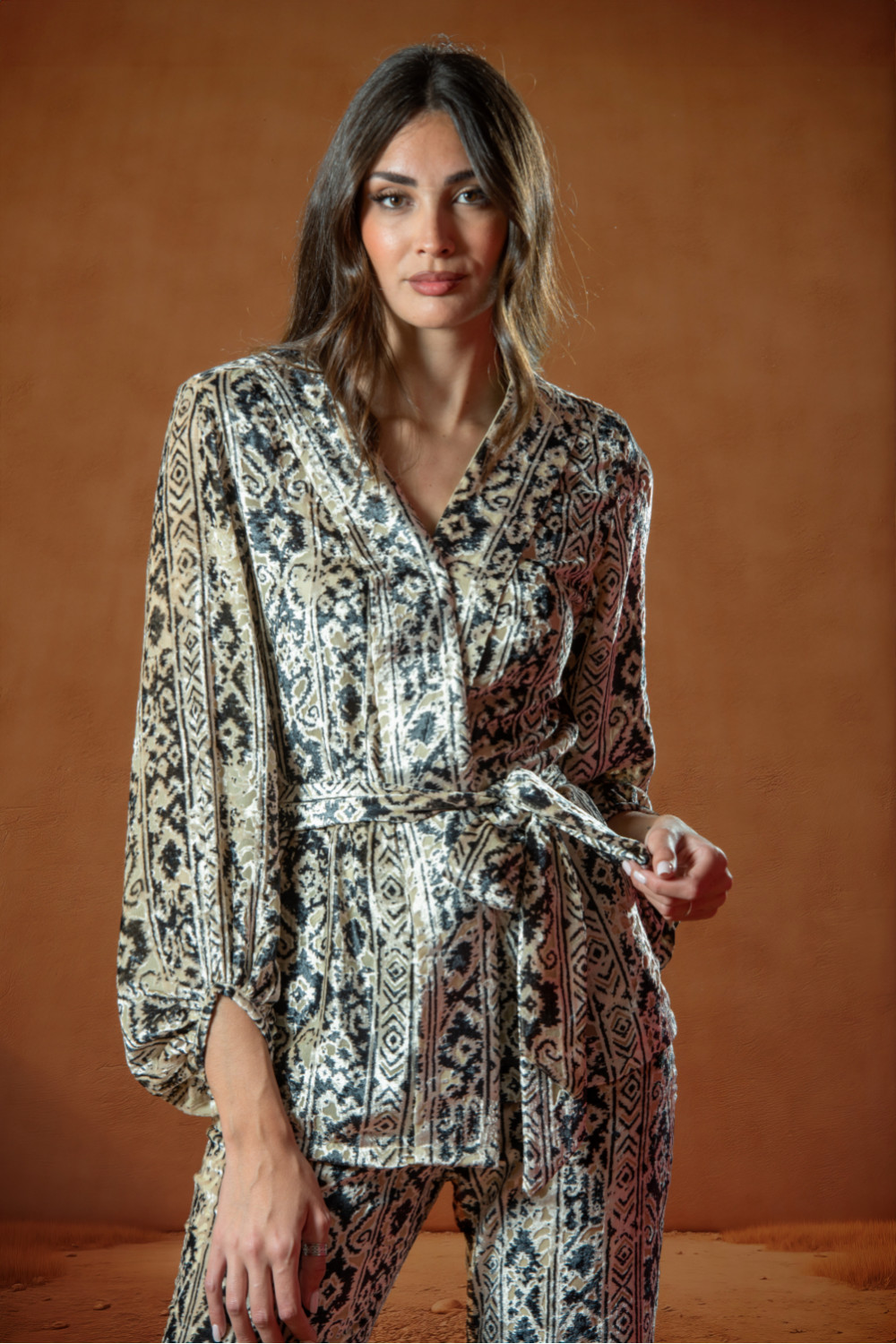 Chaqueta velvet de gasa con dibujos cenefas de terciopelo beige y negro, de manga larga globo abierta con solapa cruzada.