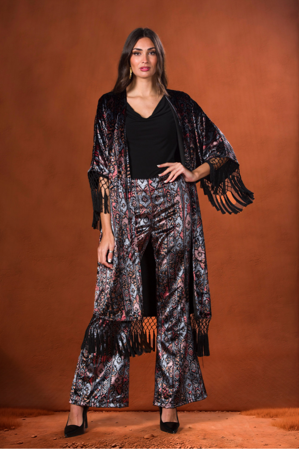VESTIDO CORREDERA ARABE DE VISCOSA CORTO Y MANGA LARGA CON CINTURA ELASTCA Y MANGA GLOBO ADORNADO CON CARRUCHITAS