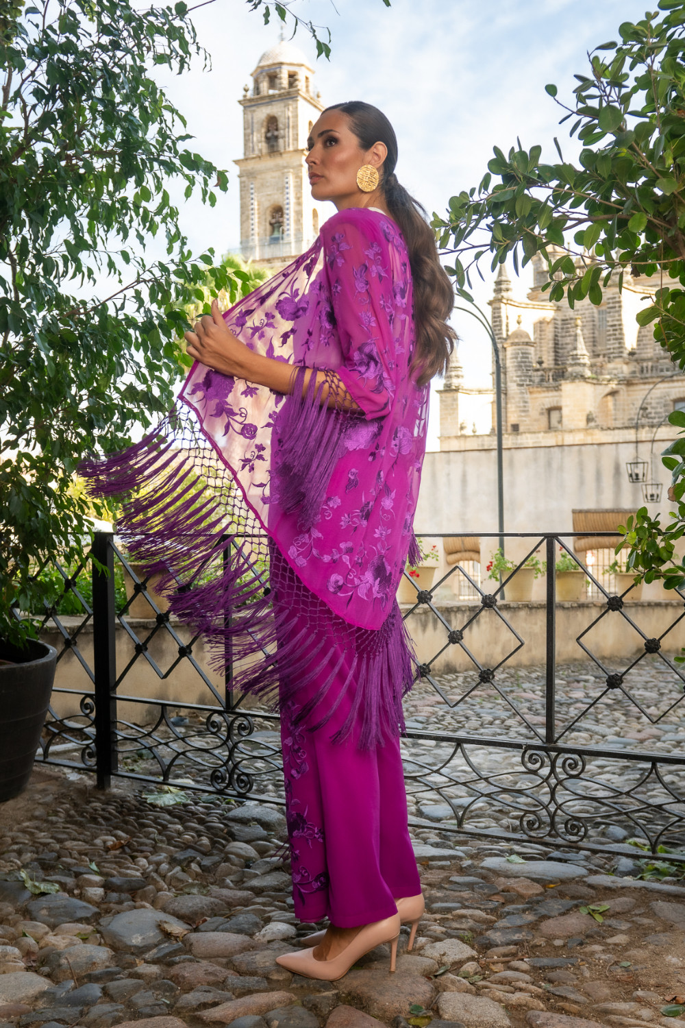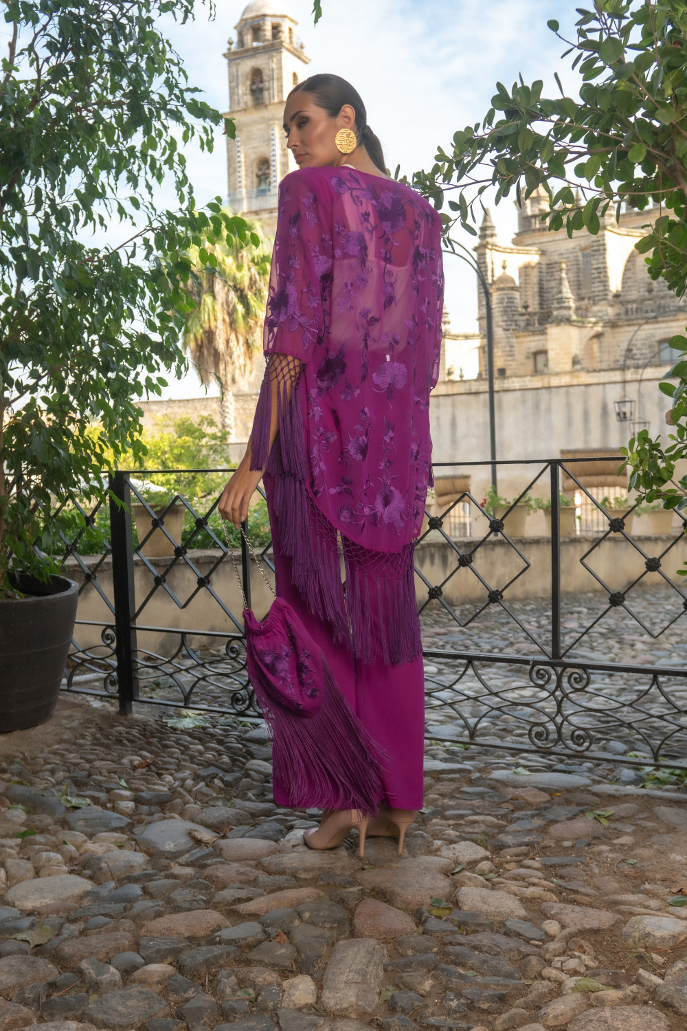 Pantalon morado bordado a tono de flores mantón.Calidad: 100% Poliéster - Forro:100% Poliéster punto
