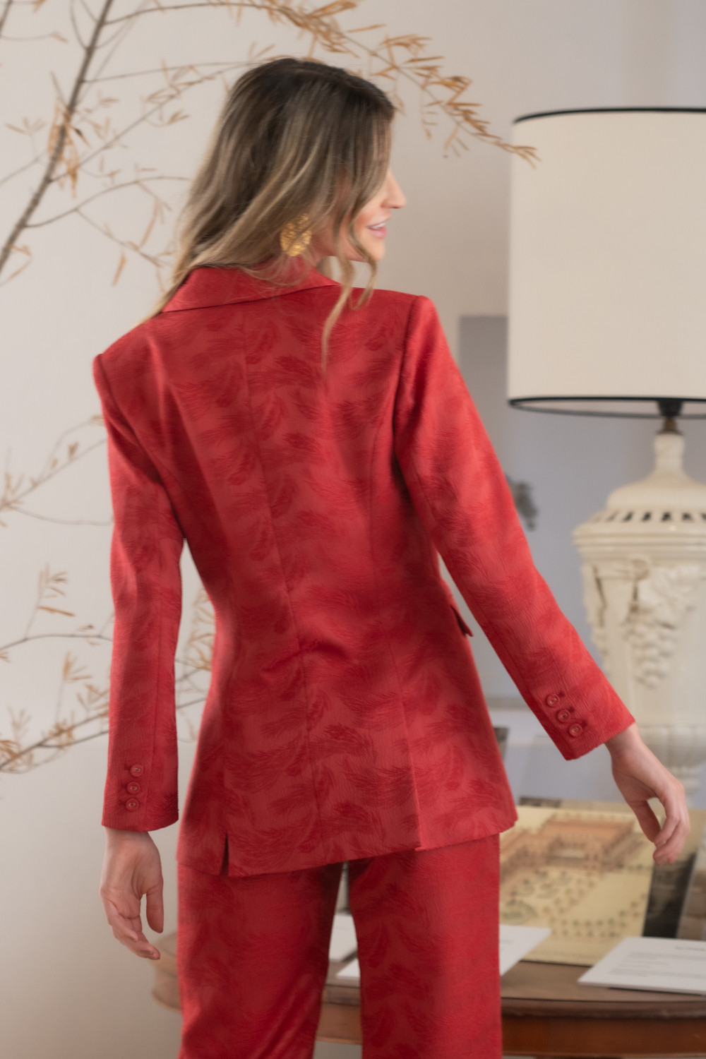 Chaqueta coral de Tejido brocado hojas , cruzada con cuatro botones y bolsillos de solapa.