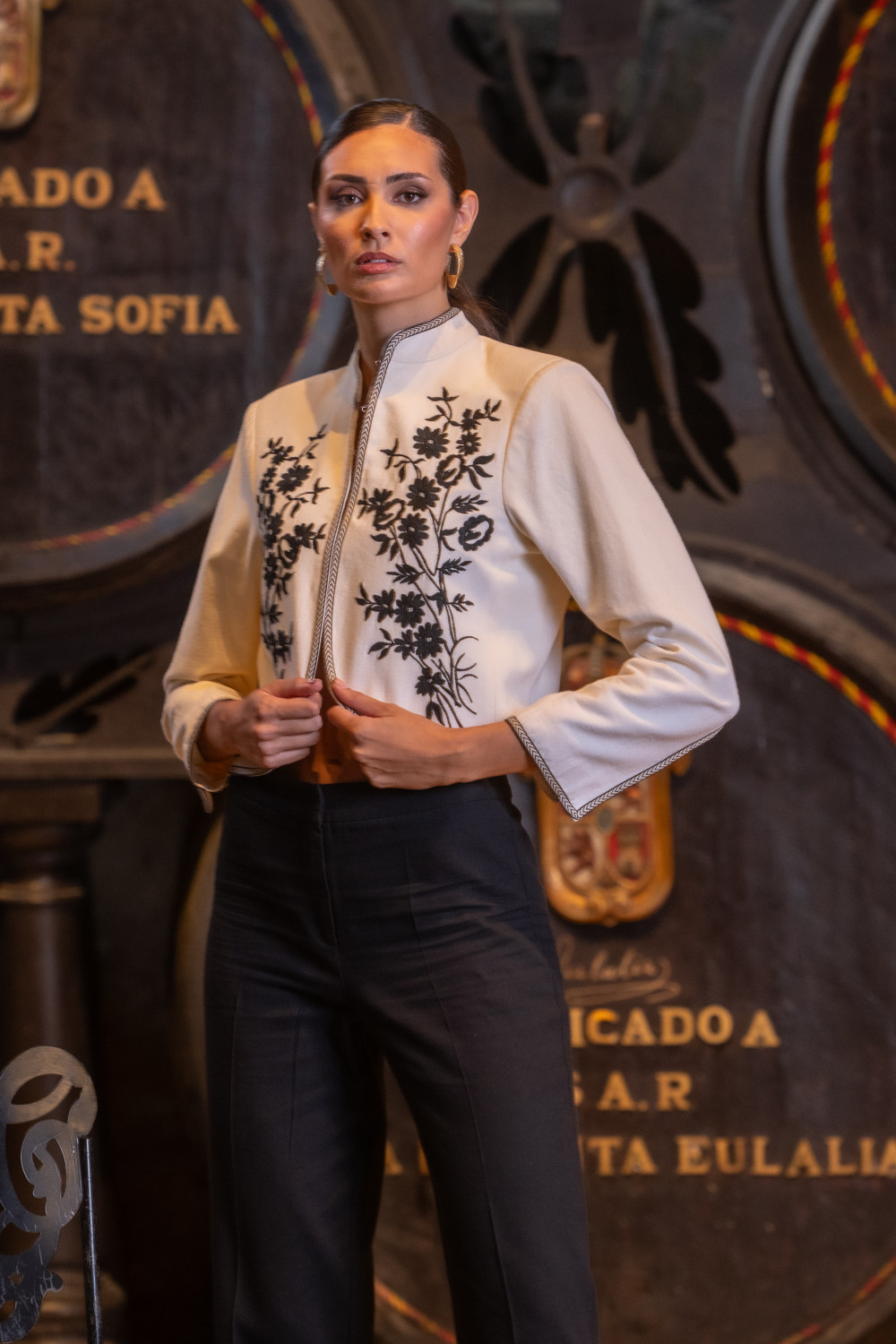 Chaqueta cruda bordada en florecitas negras, corta hasta la cintura, cuello mao y manga francesa larga.