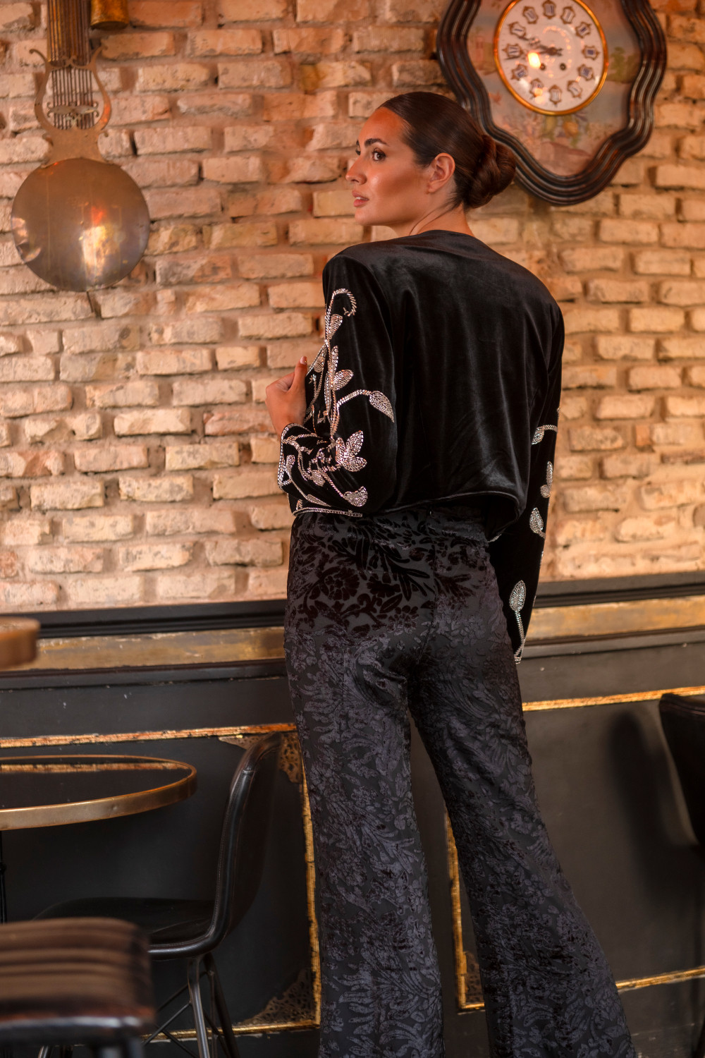 Chaqueta Romero corta de terciopelo negro con apliques de pedrería plata CALIDAD: 92 % POLYESTER 8 % SPANDEX