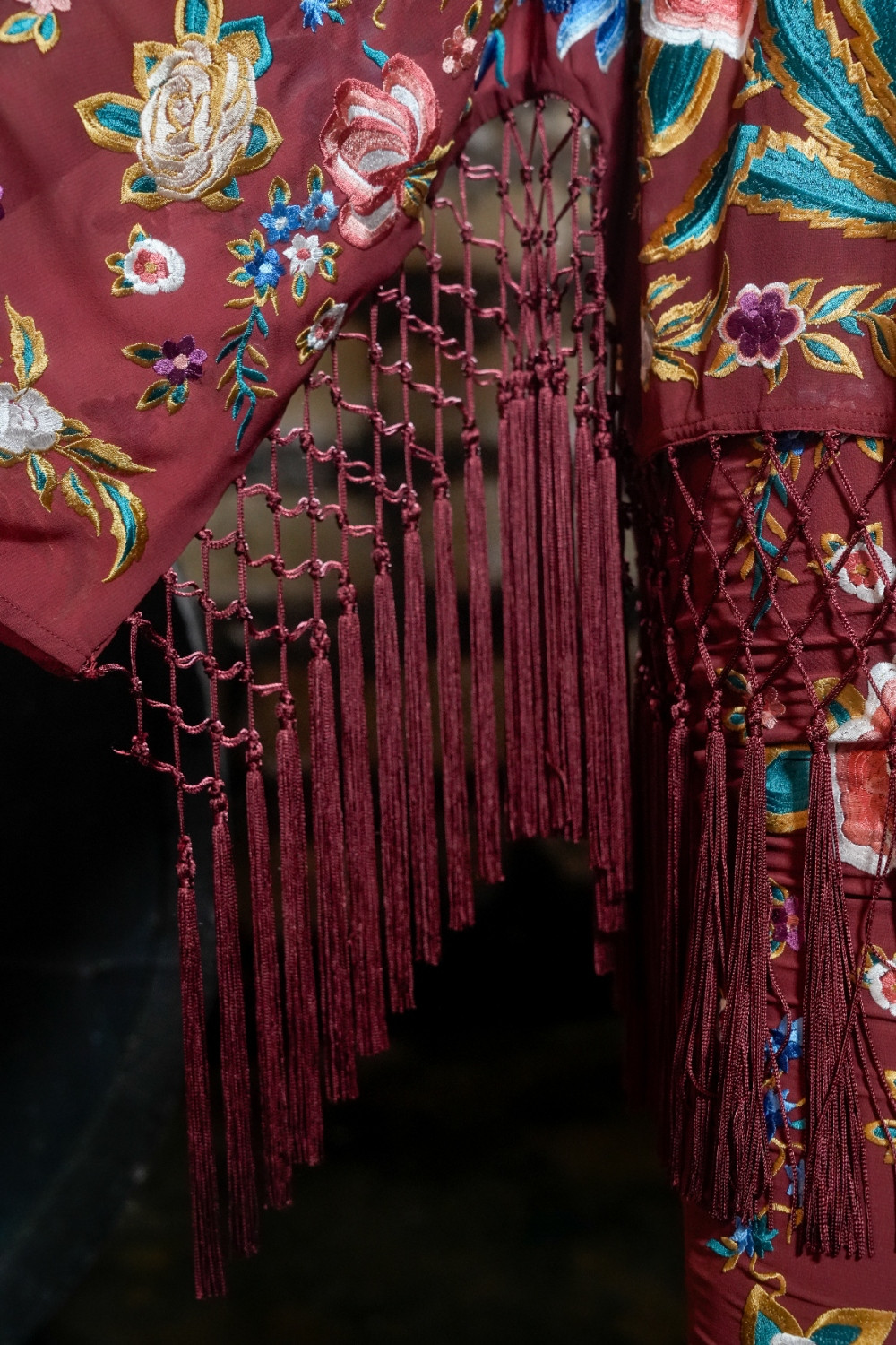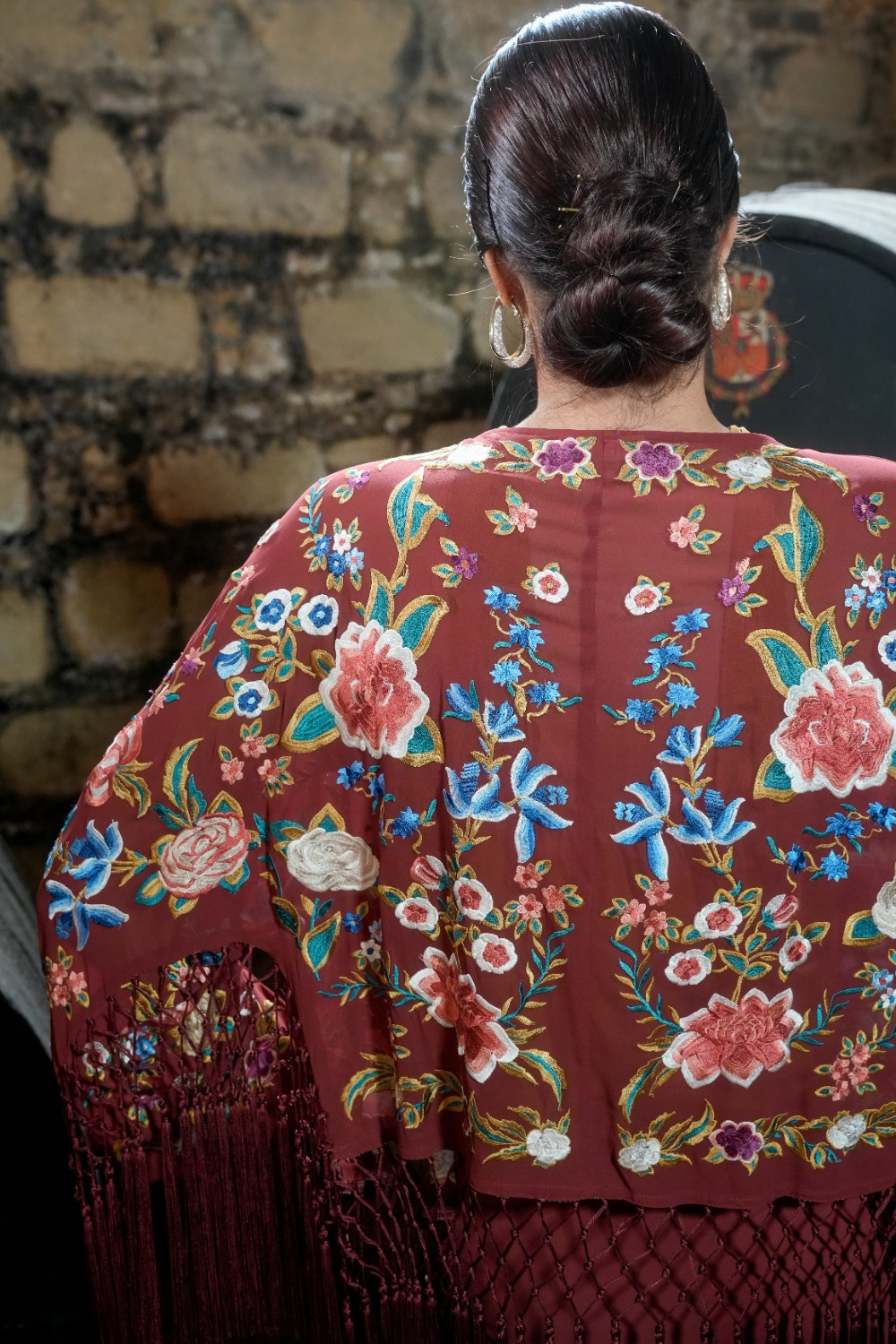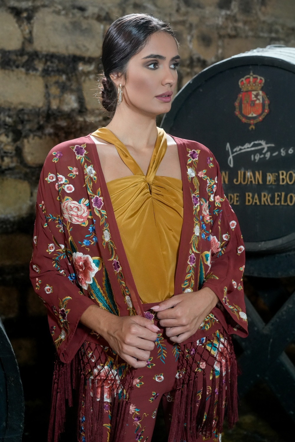 Chaqueta Valle marrón de gasa. manga francesa bordada mantón con motivos florale. flecos en el bajo y por debajo de la manga káhyra COMPOSICIÓN: 100% POLIÉSTER ACCESORIOS: FLECOS 100% VISCOSA