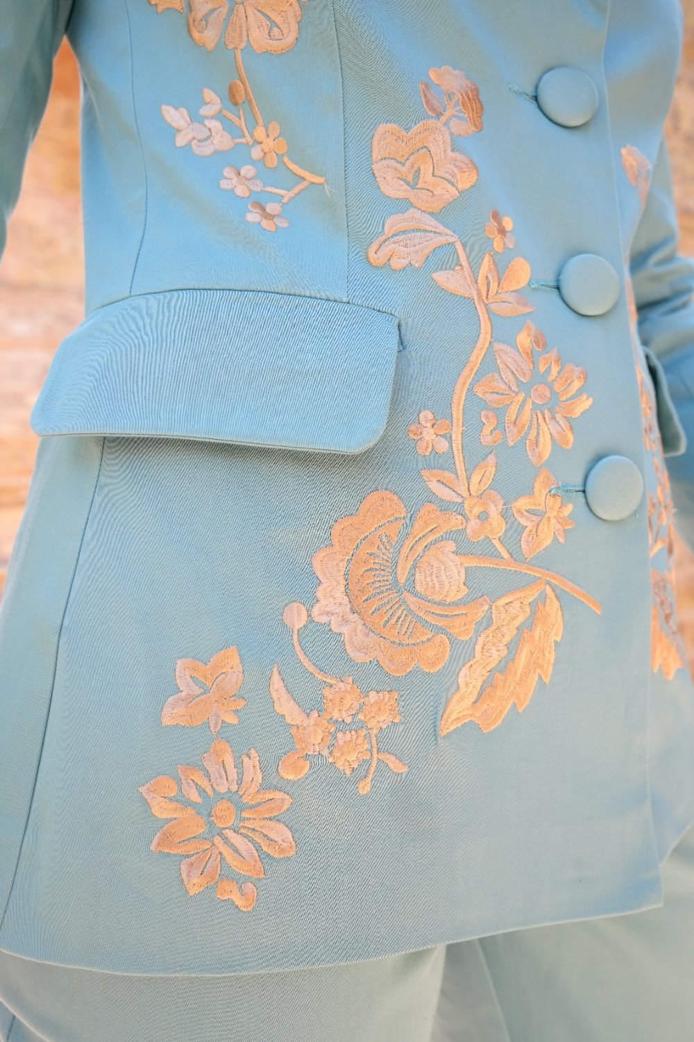 Chaqueta Bruma verde de algodón lycra gordada con motivos florales en beige tostado. manga larga. solapa y falso bolsillo con tapeta Káhyra