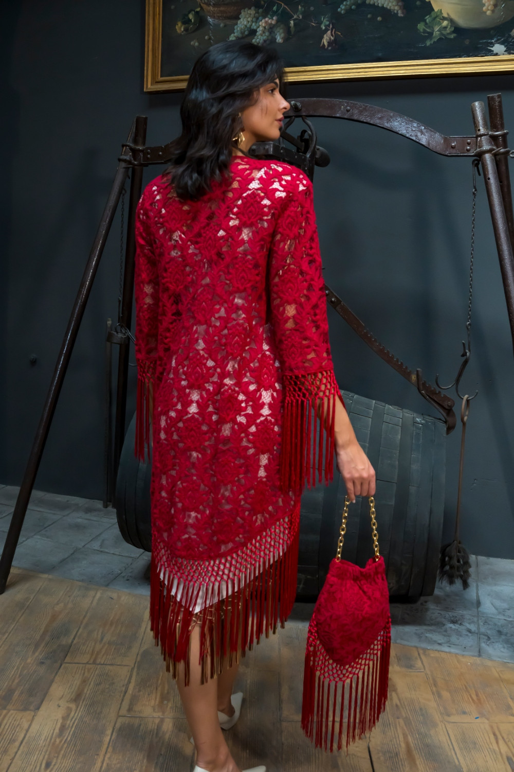 Chaqueta Saeta burdeos de encaje terminada en flecos enrejados en magas y filo Káhyra. COMPOSICIÓN: 100%POLIÉSTER ACCESORIOS: FLECOS-100% POLIÉSTER