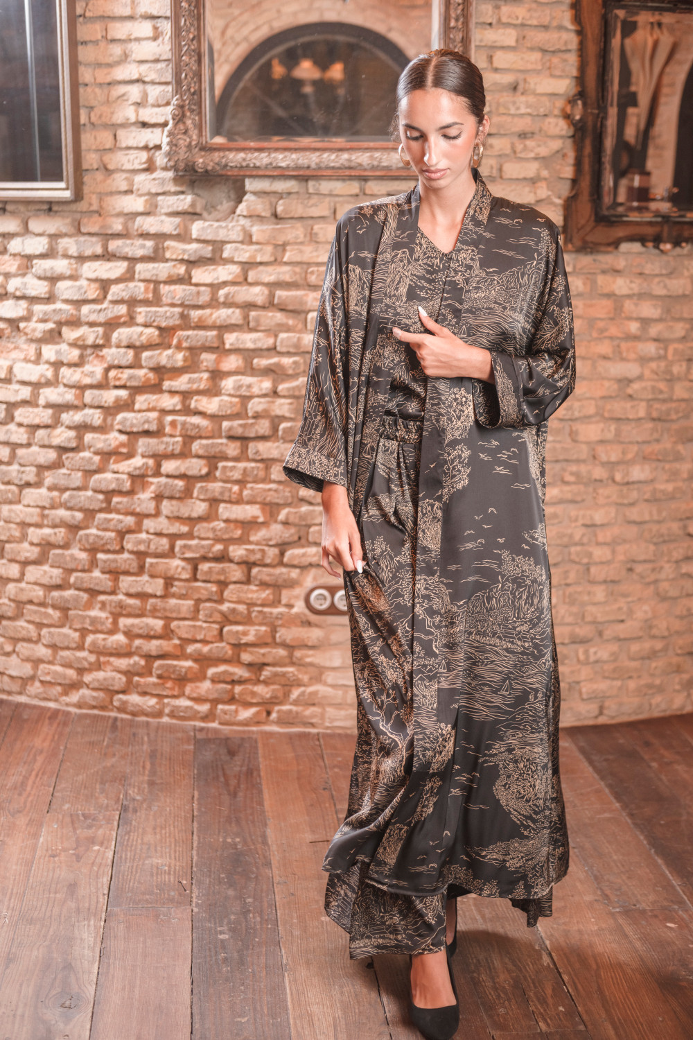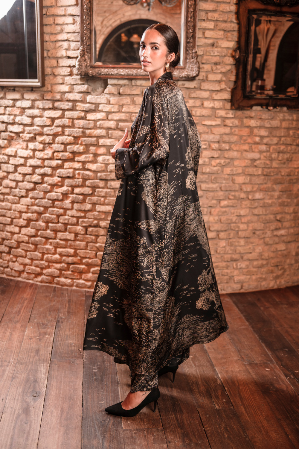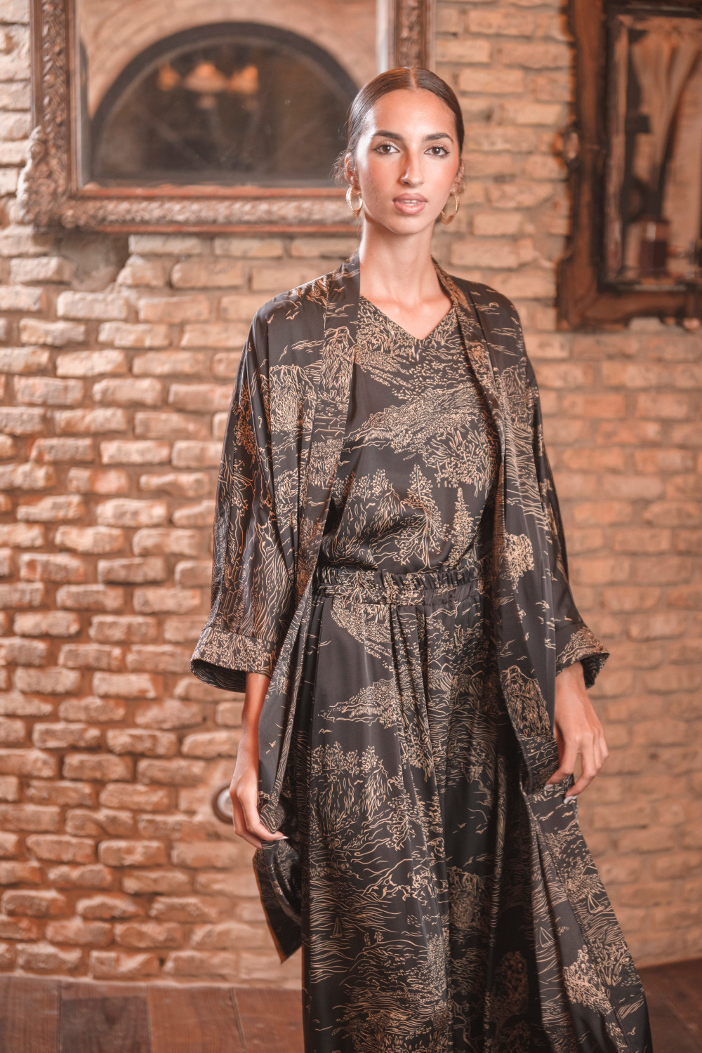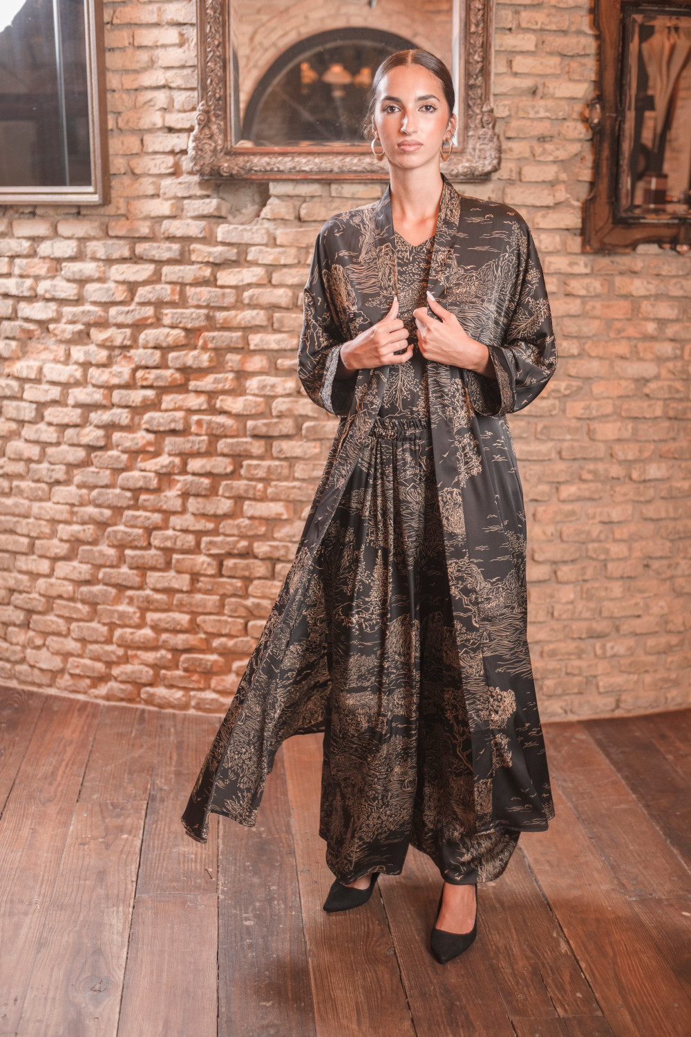 Conjunto 3 piezas kurta. pantalón y top polisilk estampado de fondo negro con grabado de árboles en dorado CALIDAD: 100 % POLYESTER