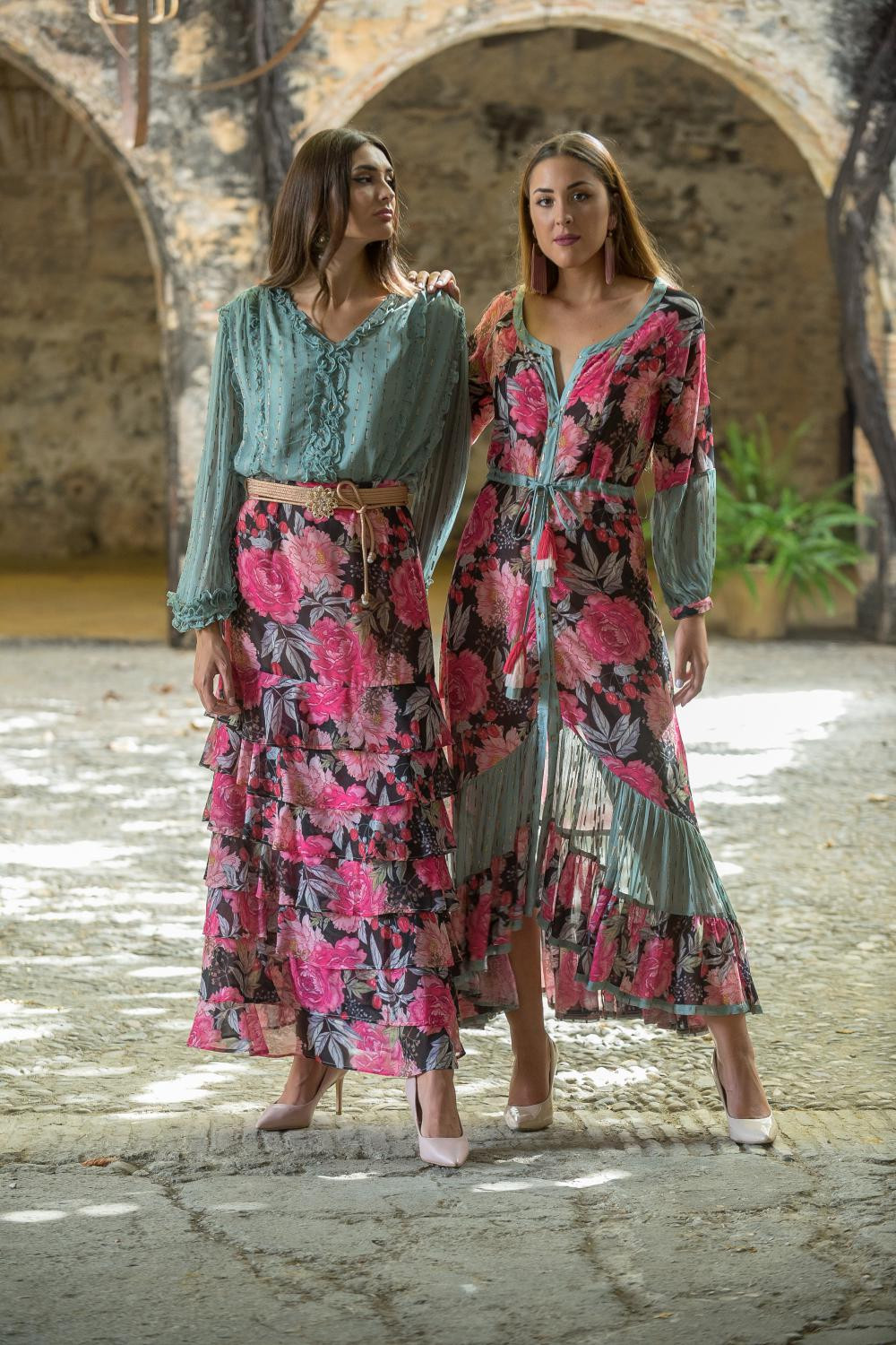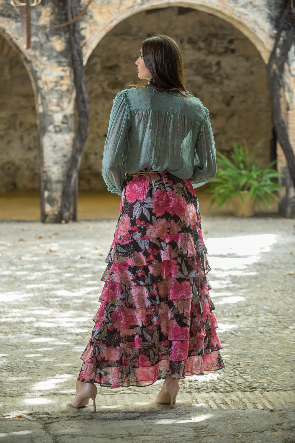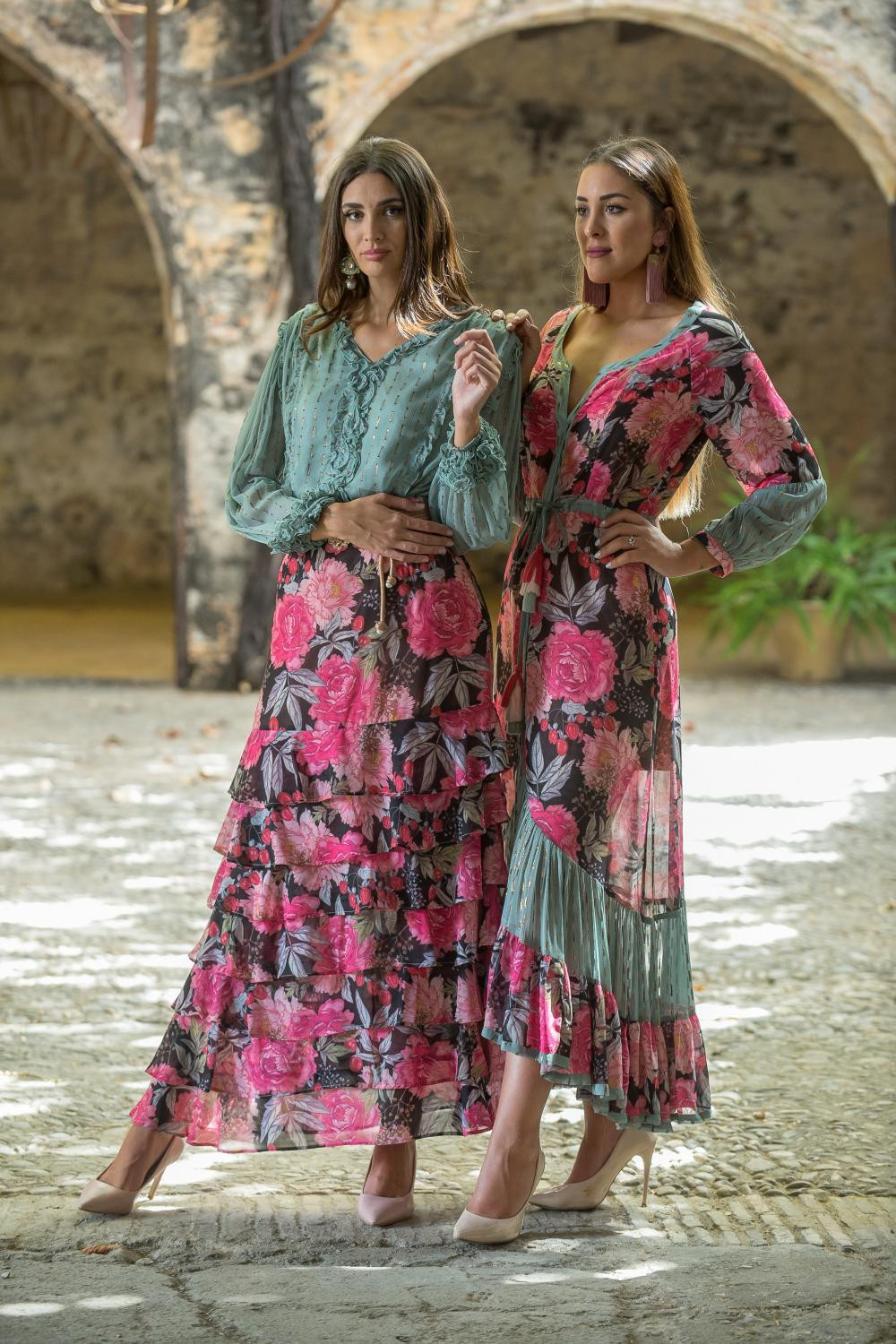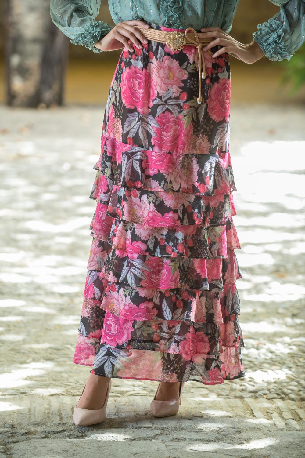 Falda de satén efecto cruzada estampado celosía con flores en tonos rosas, mostaza, verde y azules con flecos en el bajo color fucsia.COMPOSICIÓN: 100%POLIESTER