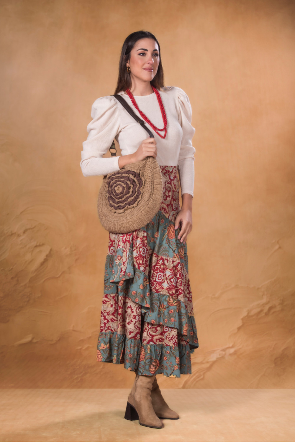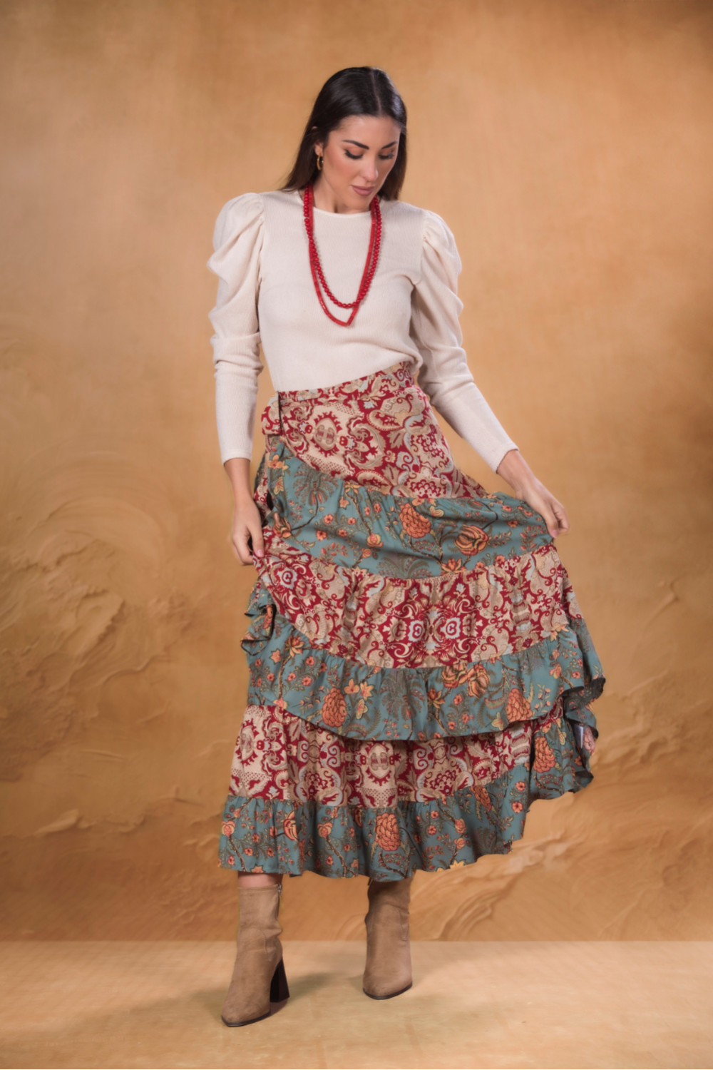 Falda verde bordada flores mantón multicolor, con sobre fleco enrejado.Calidad: 100% Poliéster - Forro:100% Poliéster - Flecos: 100% Poliéster