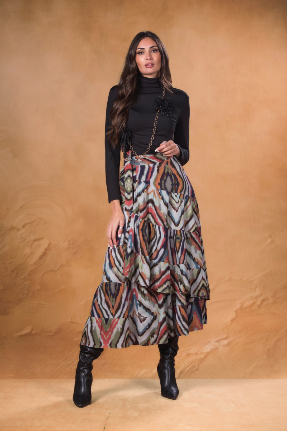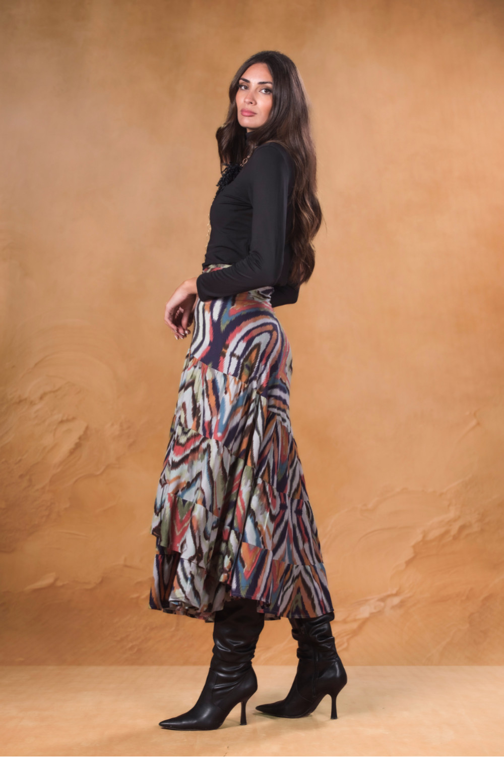 Falda aurora rombo pareo combinado estampado en tonos azules, lima acabado.