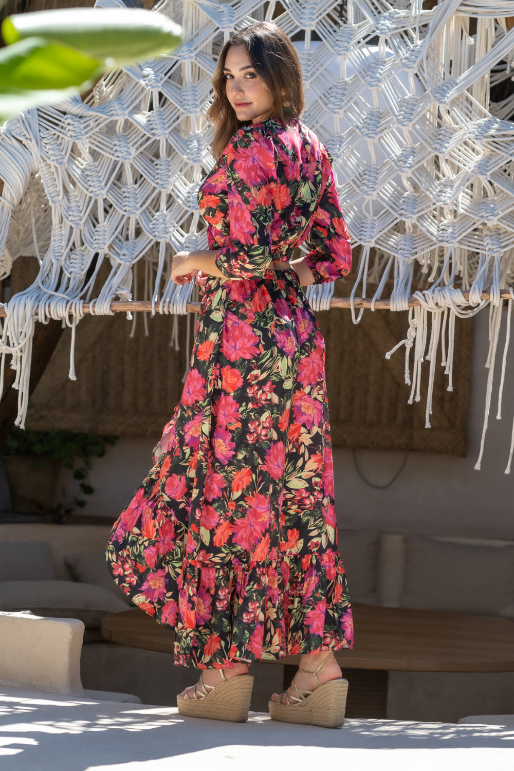 Falda cruzada con volante en polisilk con estampado de flores rojas y rosadas en fondo negro Sunset & Moon.