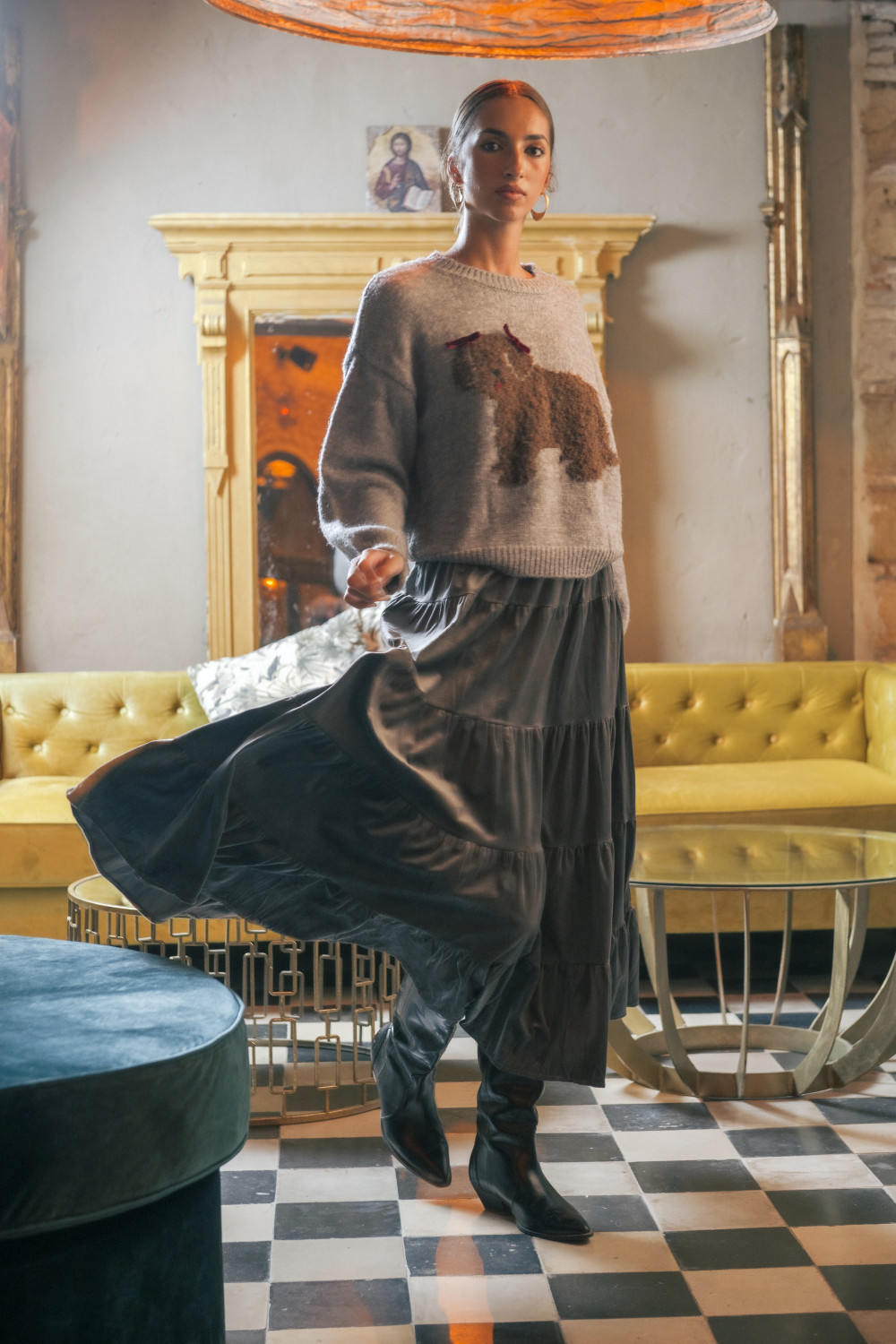 Falda Melocotón gris de tercipleo fino largo midi y volantes canasteros fruncidos CALIDAD: 100 % POLYESTER