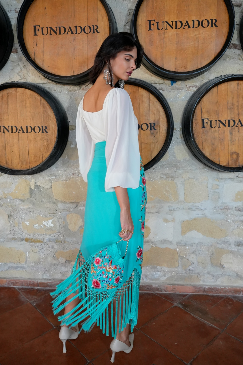 Falda Dalia aqua mantón bordada en colores con el bajo en pico asimetrico con flecos al tono Káhyra. COMPOSICIÓN: 100% POLIÉSTER FORRO: 100% POLIÉSTER ACCESORIOS: FLECOS 100% VISCOSA