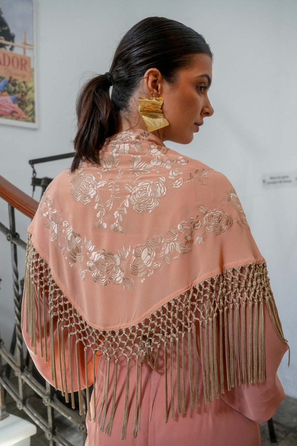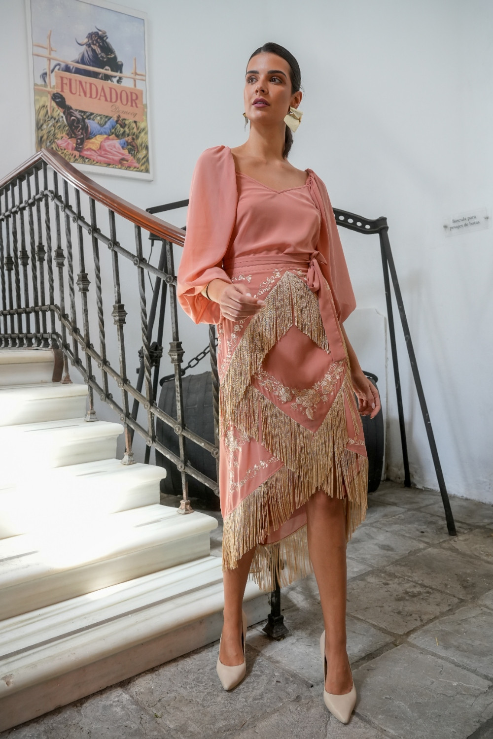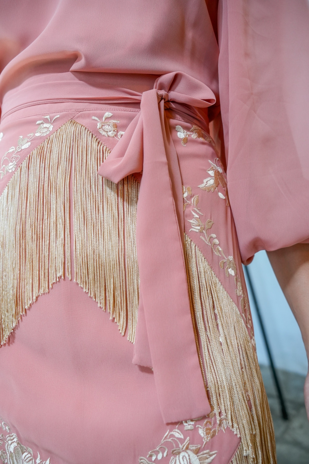 Falda Lumbre salmón de gasa bordada con motivos florales en beige tostado y con flecos del mismo tono formando picos efecto mantón kahyra.