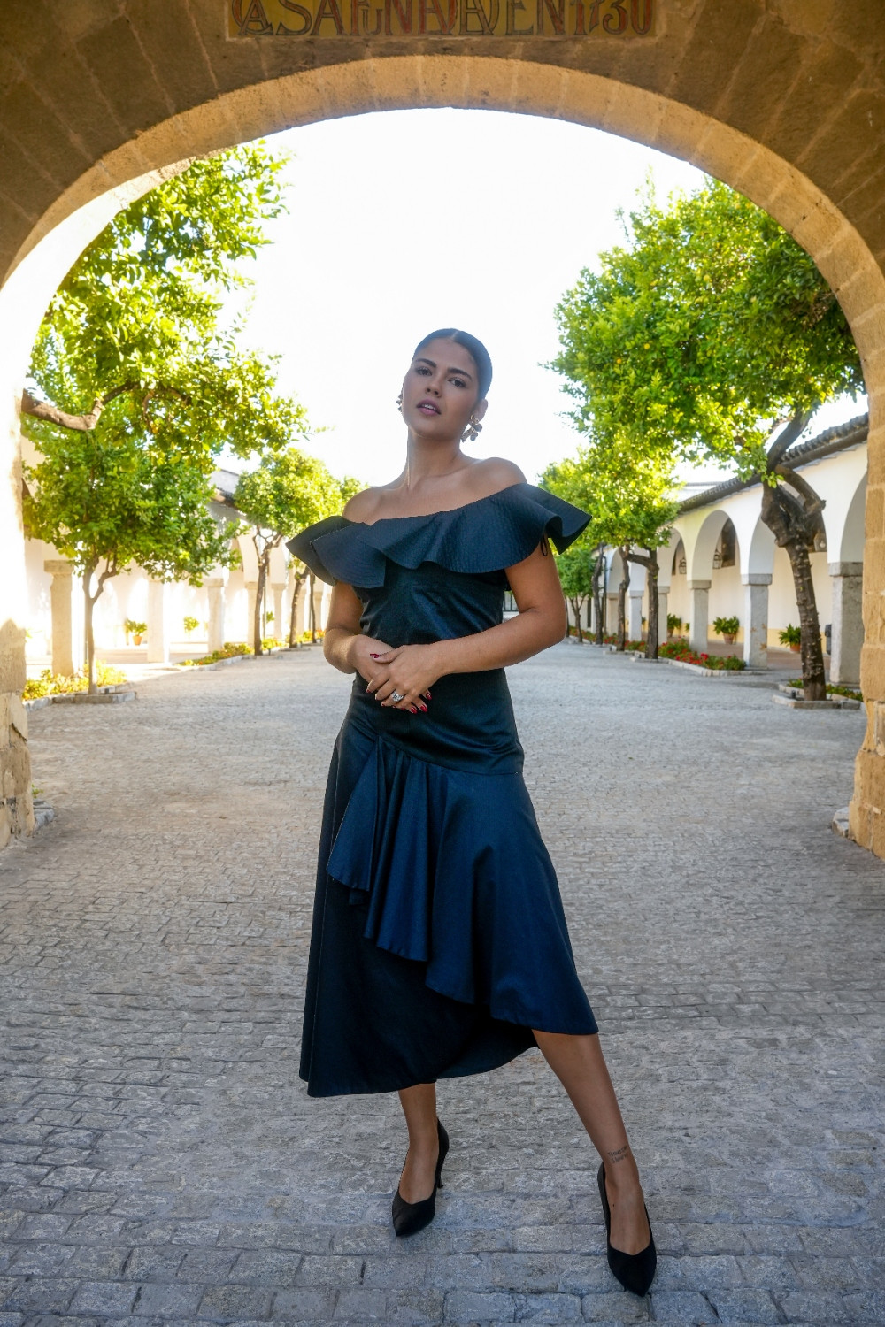 Falda Tulipán negra lisa con cinturilla hasta la cadera y volante de capa que envuelve káhyra. COMPOSICIÓN: 100% ALGODÓN