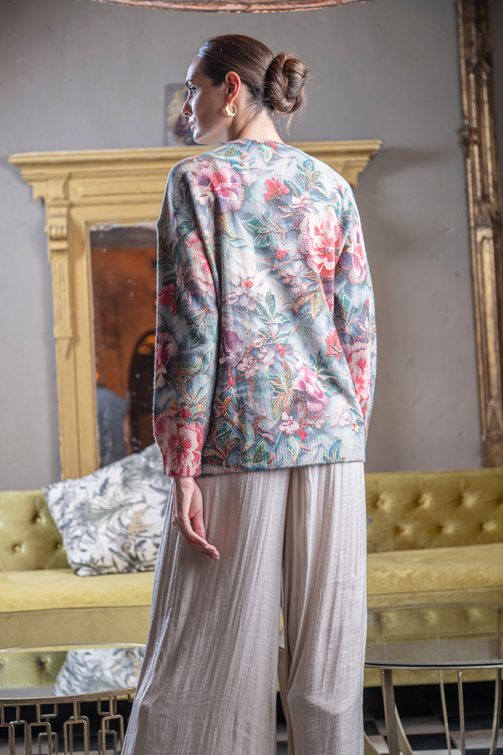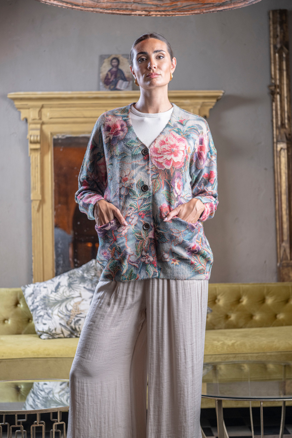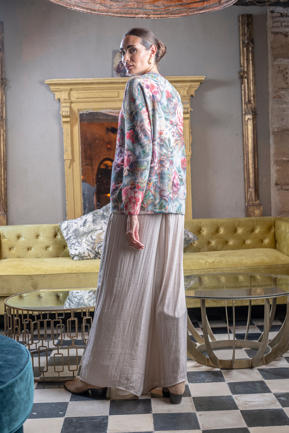 Jersey curry abotonado con bolsillos de fondo beige y flores color buganvilla CALIDAD: 100 % POLYESTER