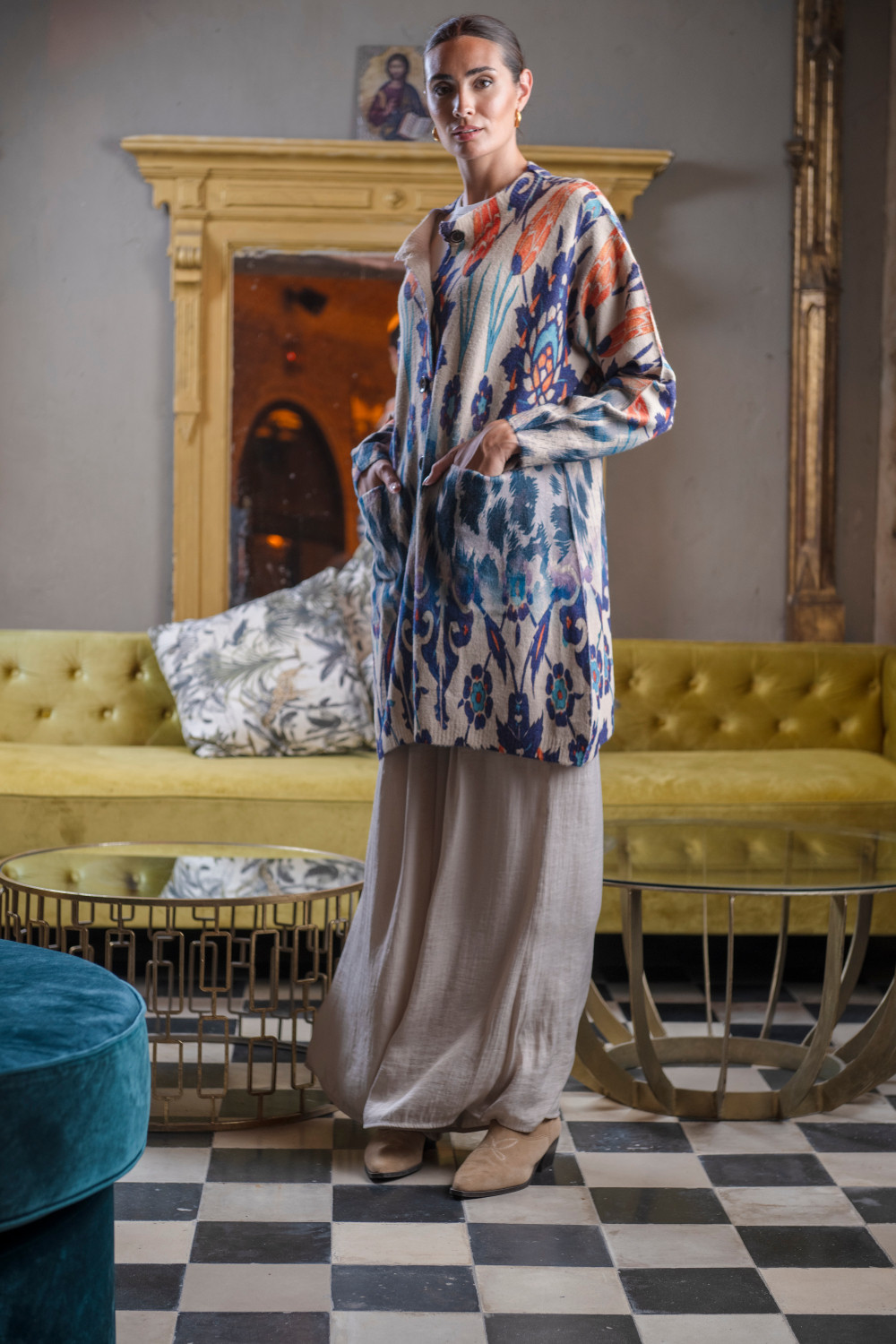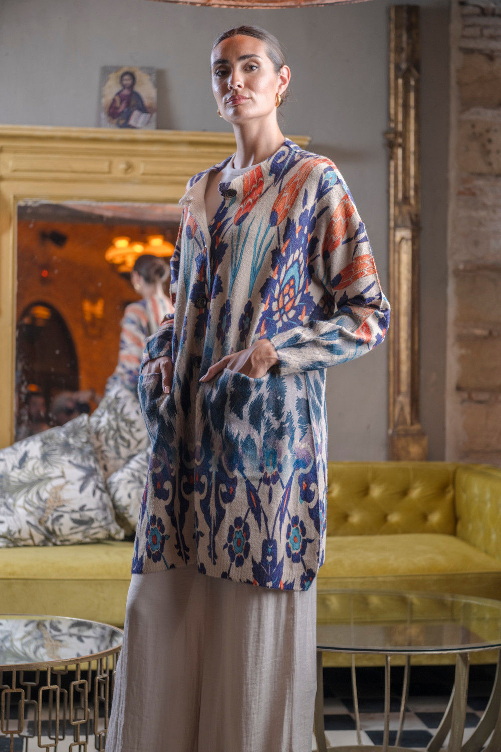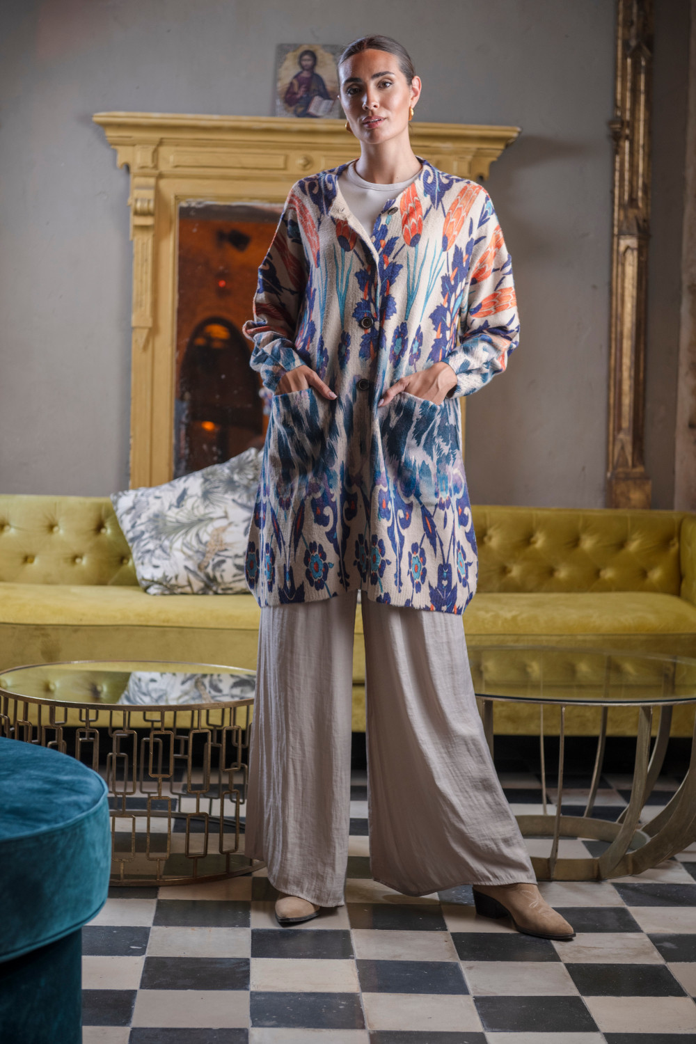 Jersey curry abotonado con bolsillos de fondo beige y flores color naranja y morado CALIDAD: 100 % POLYESTER