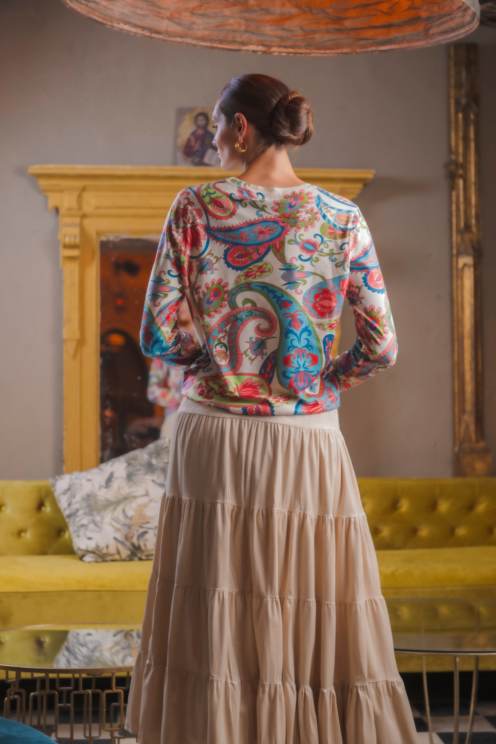 Jersey Jungly cashemir de colores y fondo beige con cuello a la caja CALIDAD: 100 % POLYESTER