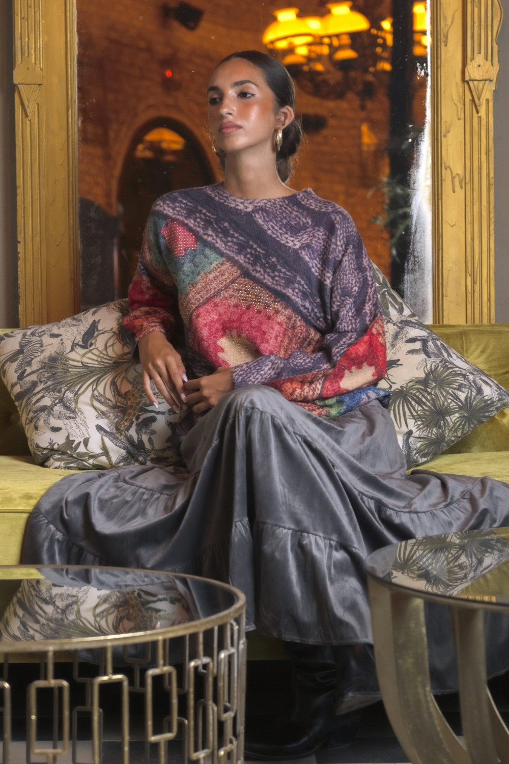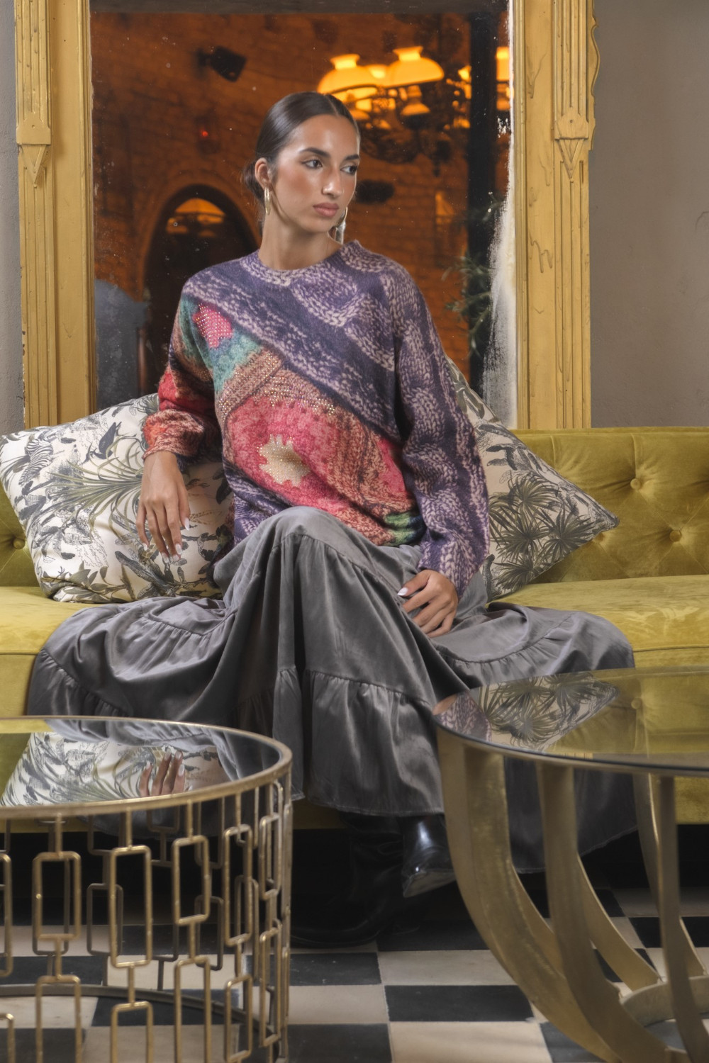 Jersey tomillo estampado efecto lana tonos malvas coral y verde cuello a la caja CALIDAD: 100 % POLYESTER