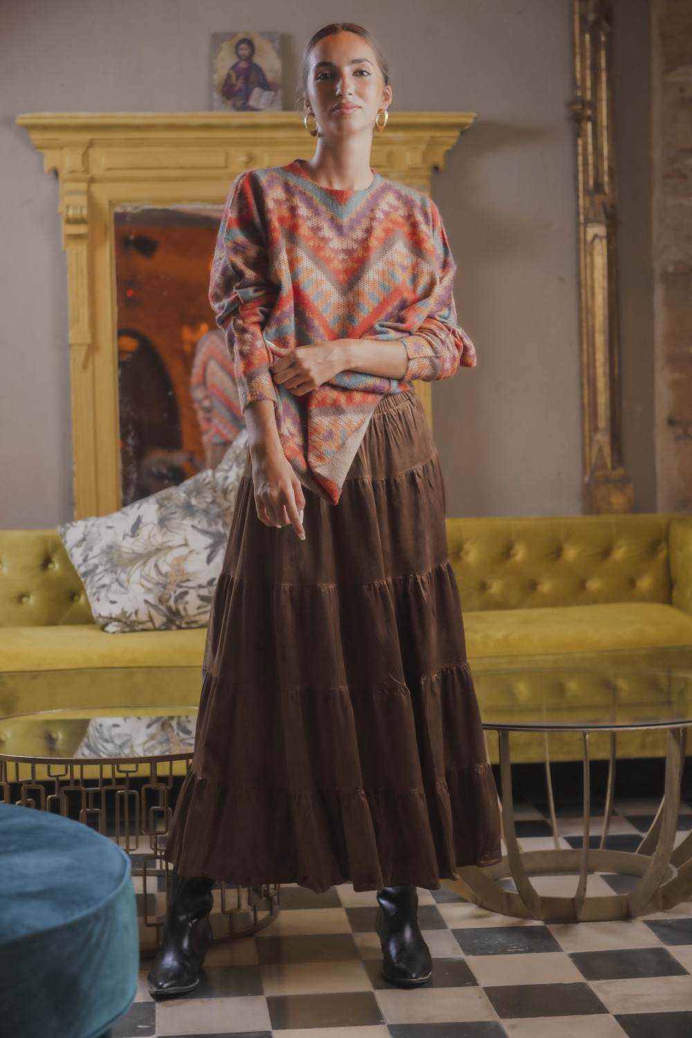 Jersey tomillo estampado zigzag en tonos naranjas. tierras y azules con cuello a la caja CALIDAD: 100 % POLYESTER