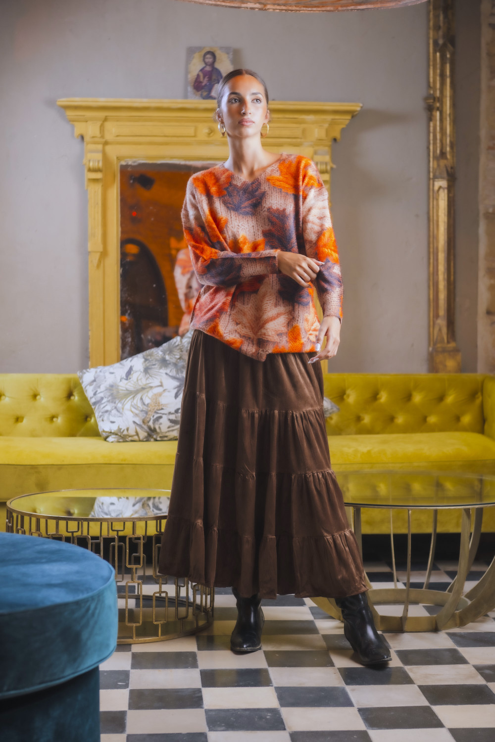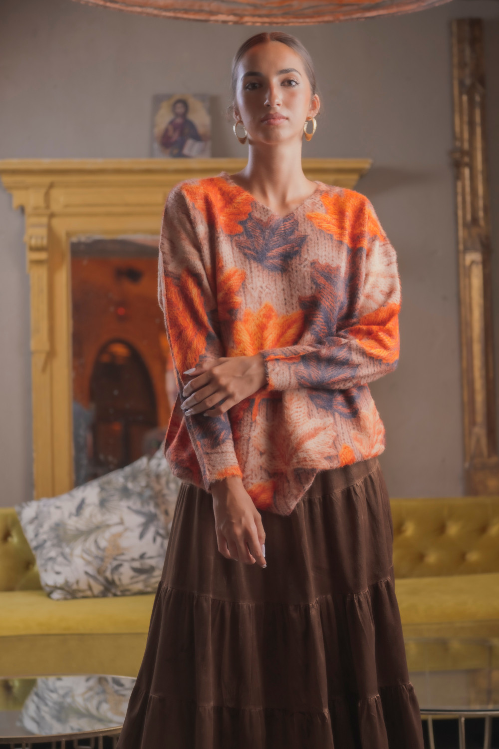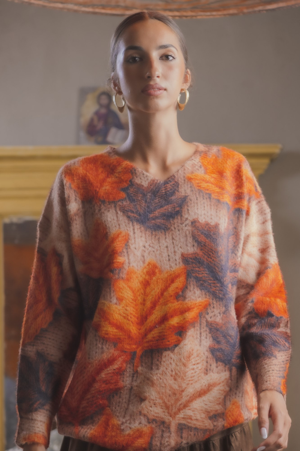 Jersey tomillo hojas secas de otoño en tonos marrones y naranjas con cuello de pico CALIDAD: 100 % POLYESTER