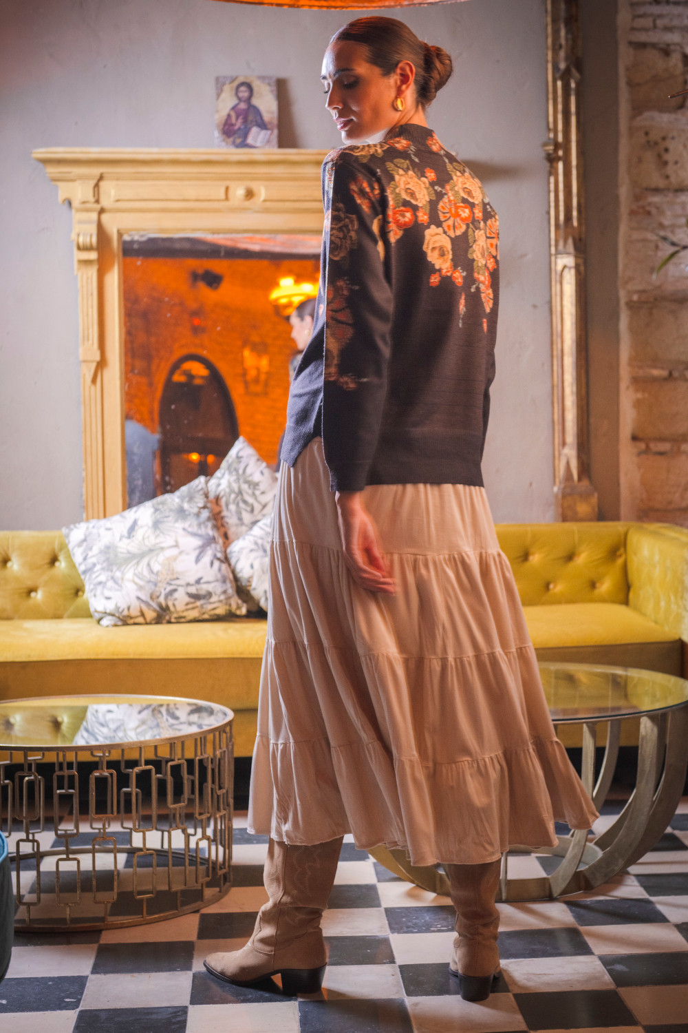 Jersey tomillo fondo negro con flores rodeando el cuello a la caja en color naranja CALIDAD: 100 % POLYESTER