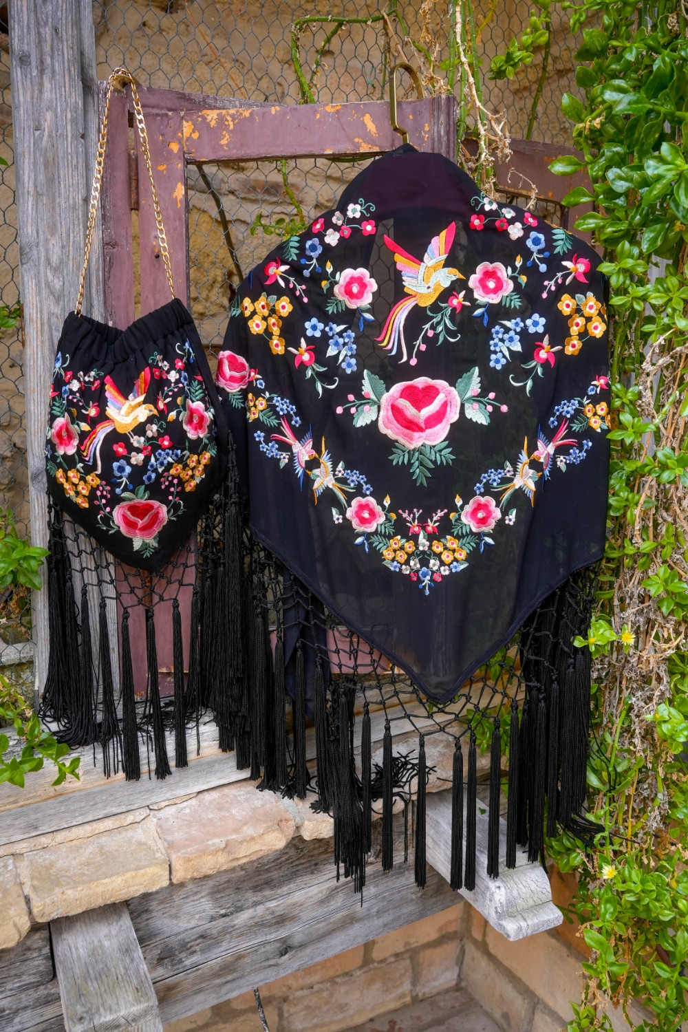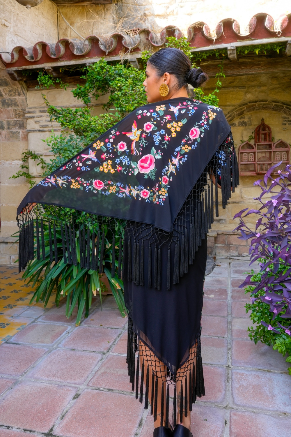 Mantón Dalia negro bordado con flores y pajaro con plumas de colores Káhyra