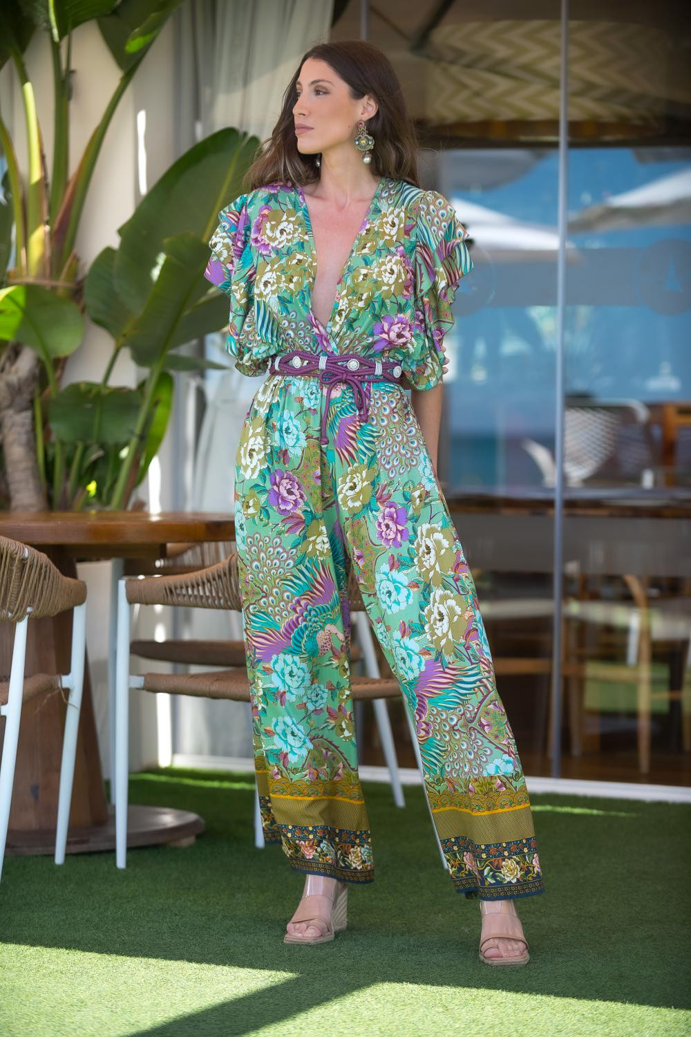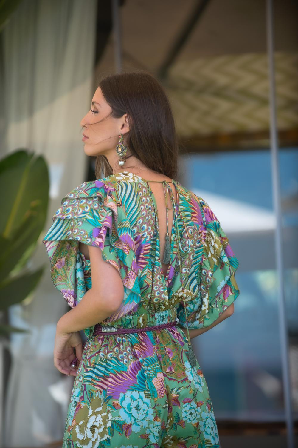 Vestido largo estampado Amazonic,escote pico, mangas francesa terminada en volante fruncido y doble volante en falda.Pasamanería con borlones de flecosCOMPOSICIÓN: 100% VISCOSA