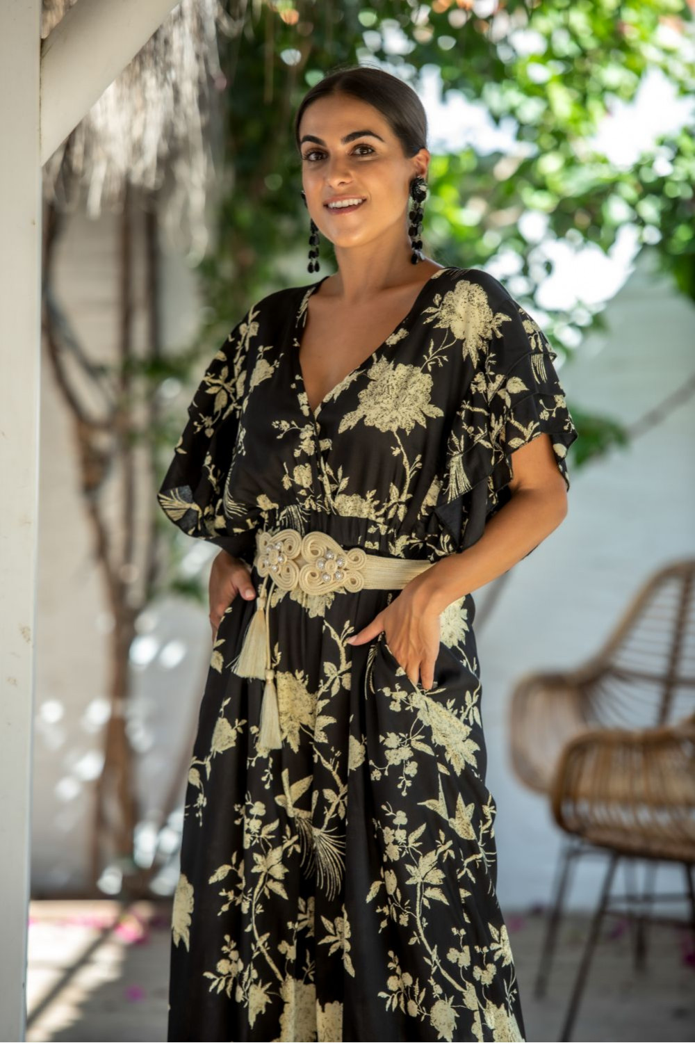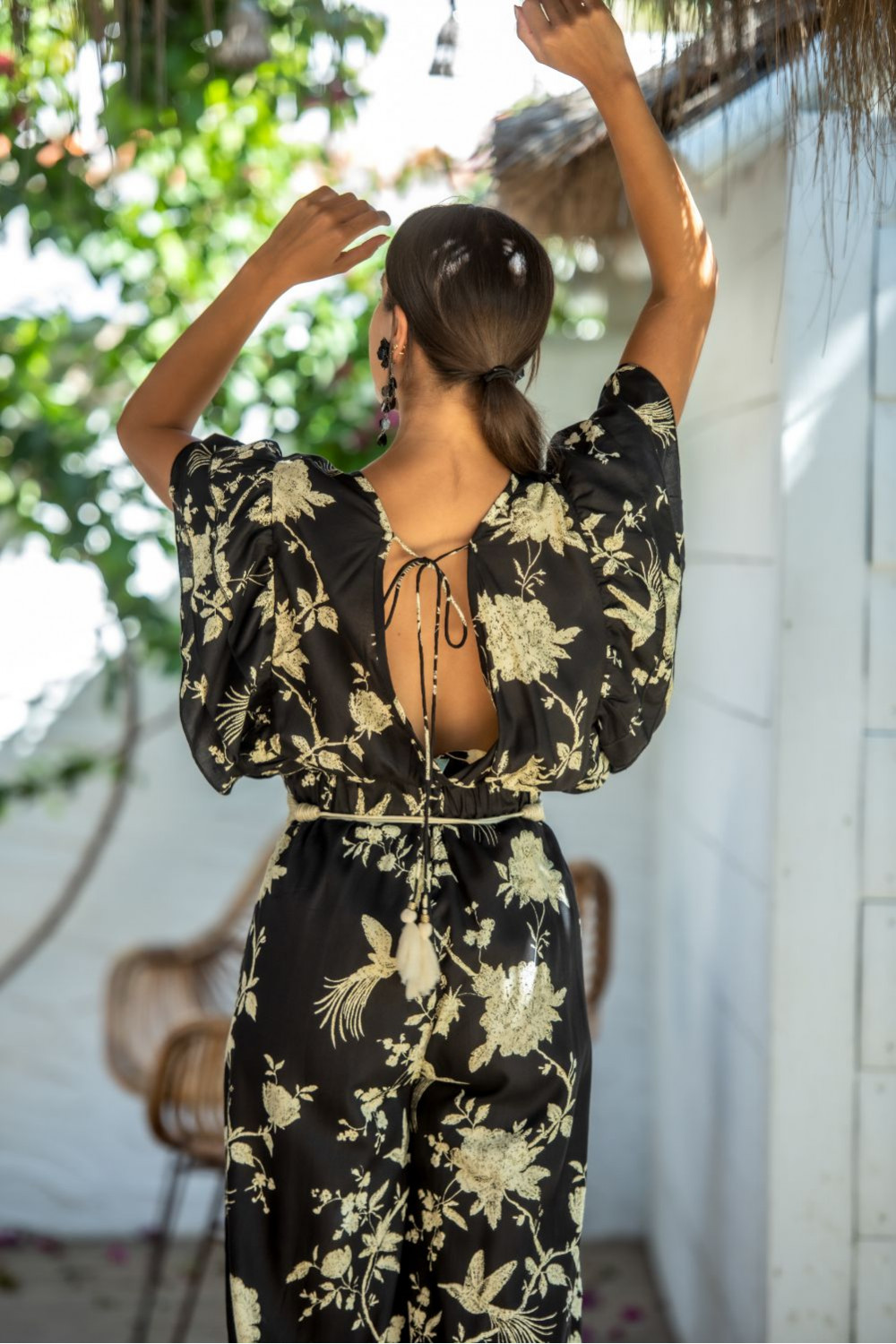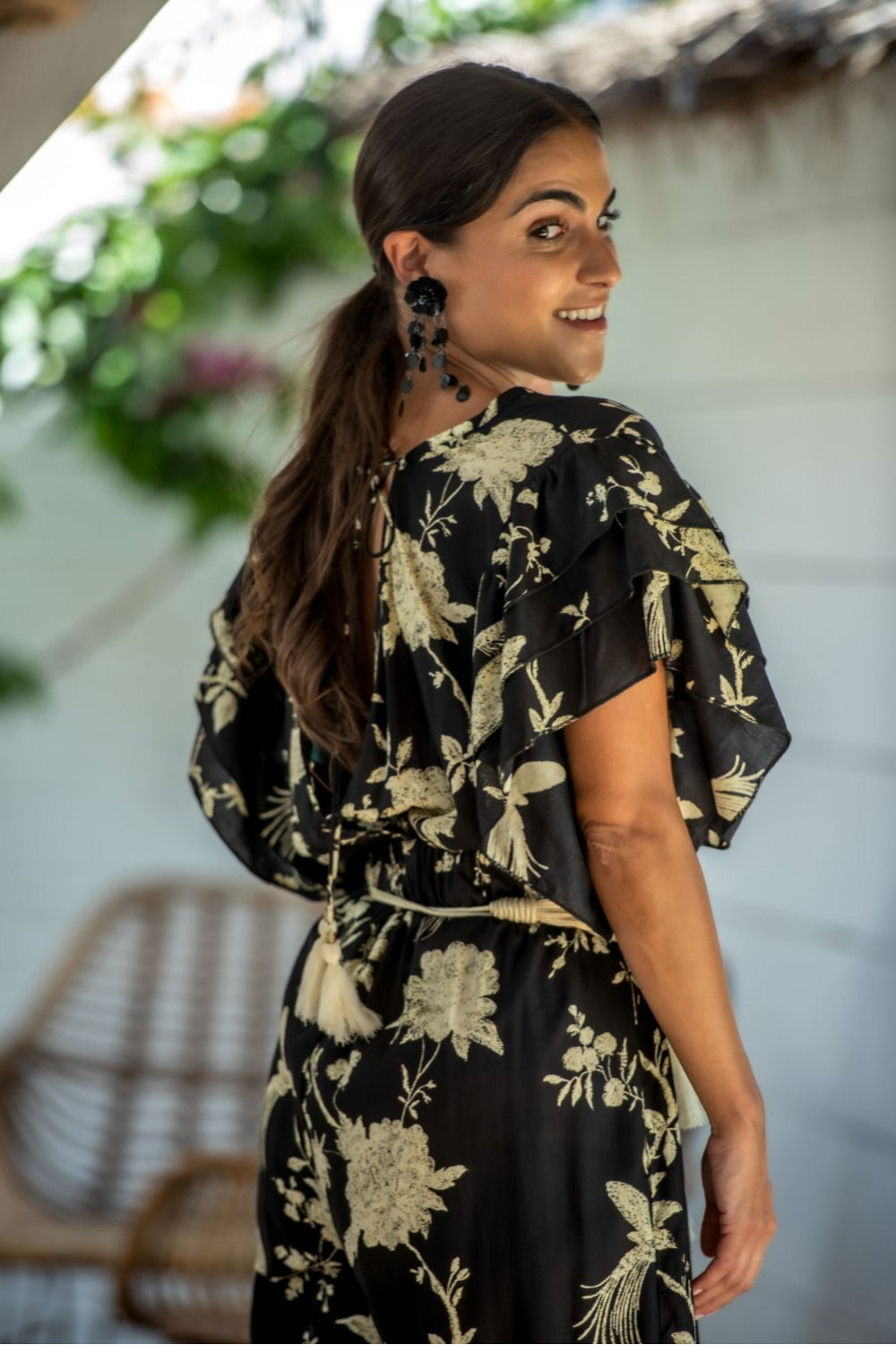 Mono kavala de viscosa negro con flores de mantón beige sin mangas con doble volante en el hombro, cintura fruncida escote cruzado delante y en la espalda.