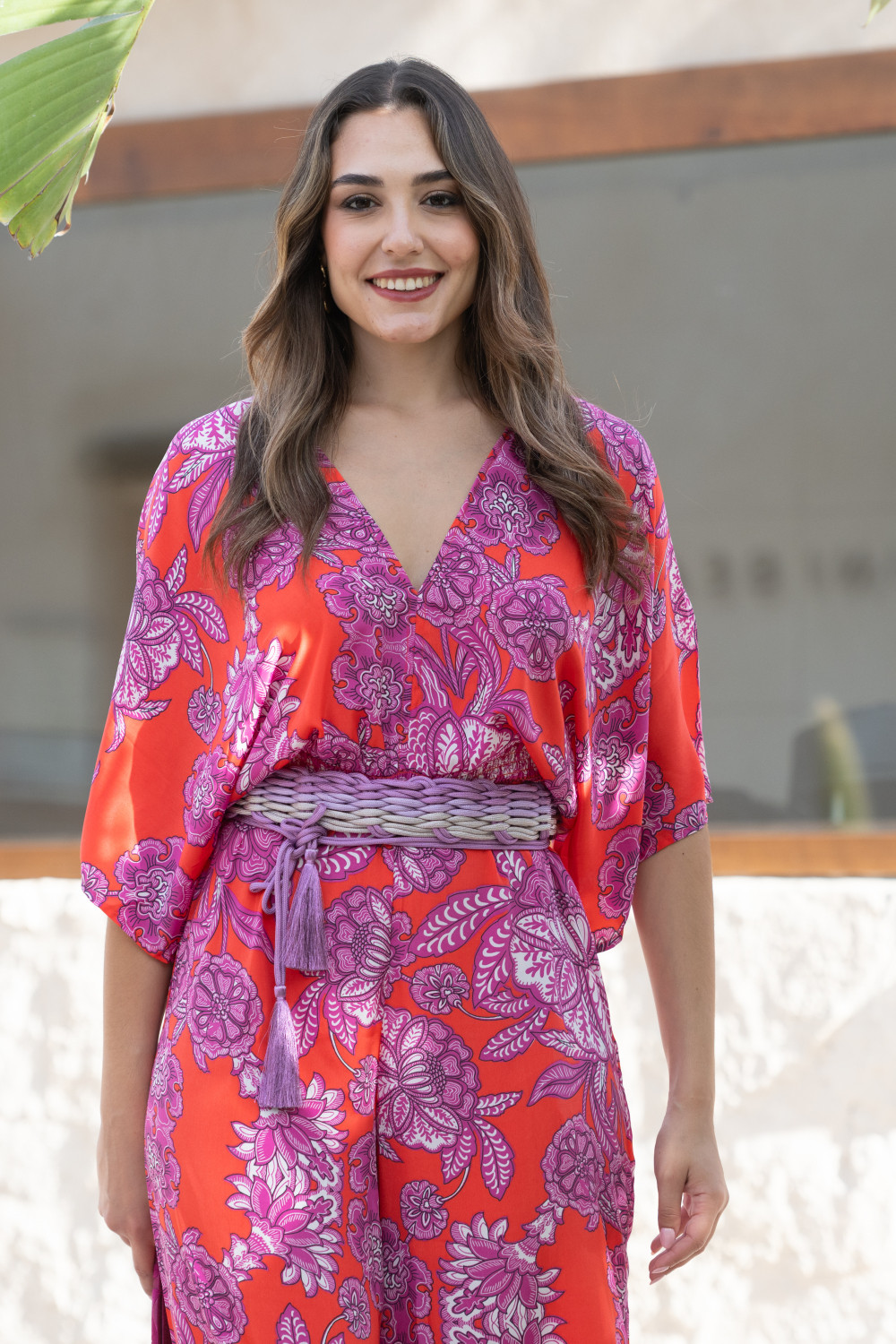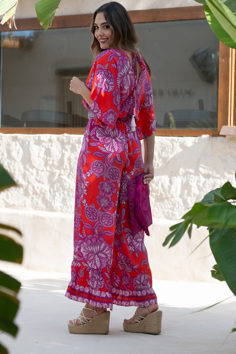 Mono oversize con volantes en manga y bajo en polisilk con estampado en tonos coral y morado Sunset & Moon.