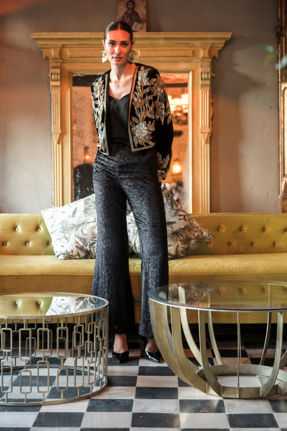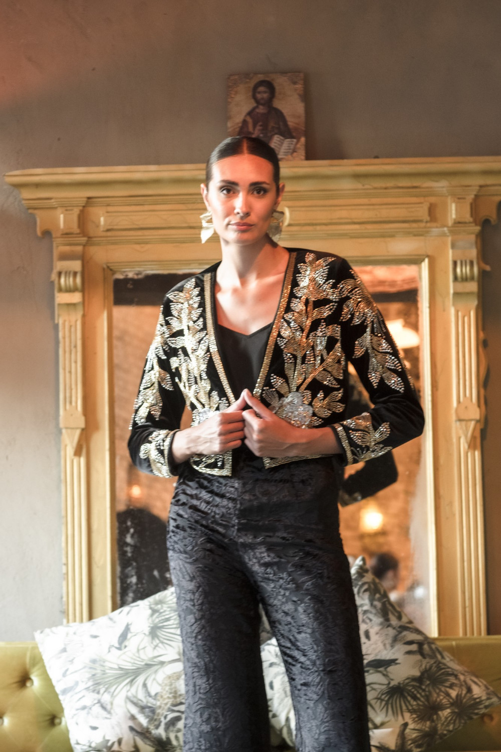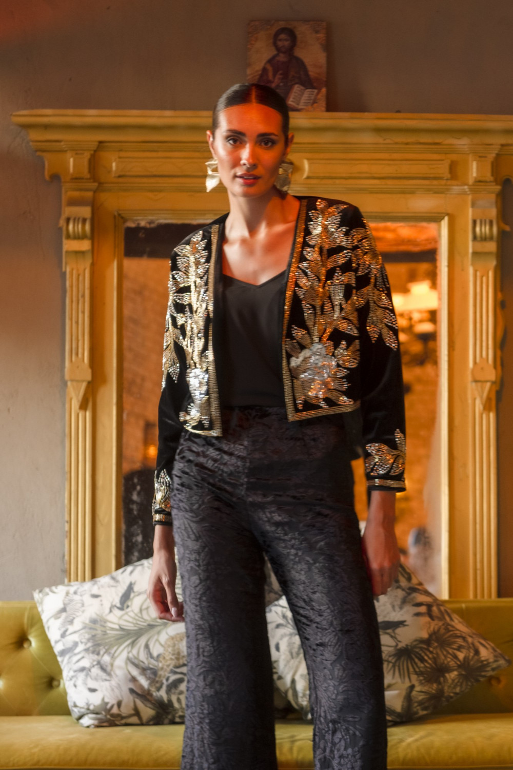 Chaqueta Romero corta de terciopelo negro con apliques de pedrería oro y plata CALIDAD: 92 % POLYESTER 8 % SPANDEX
