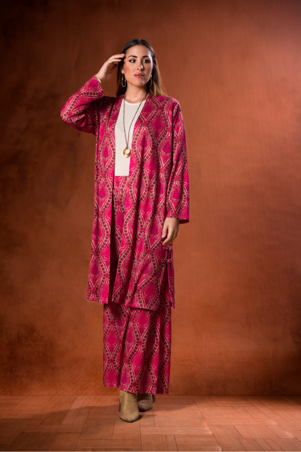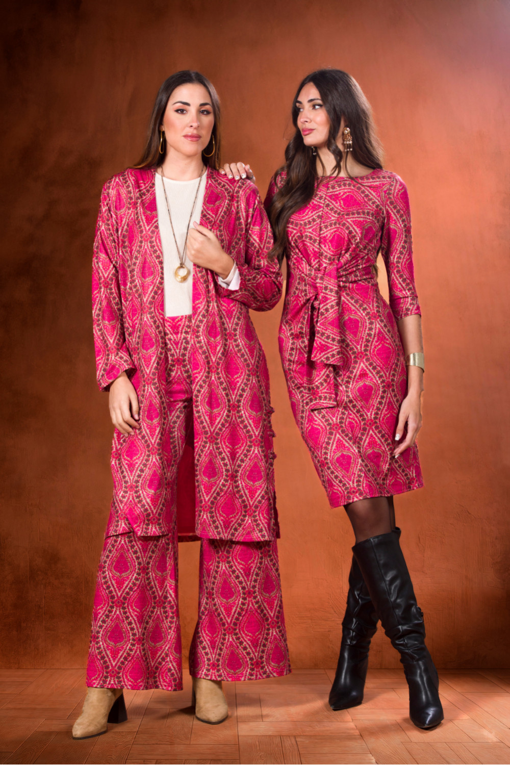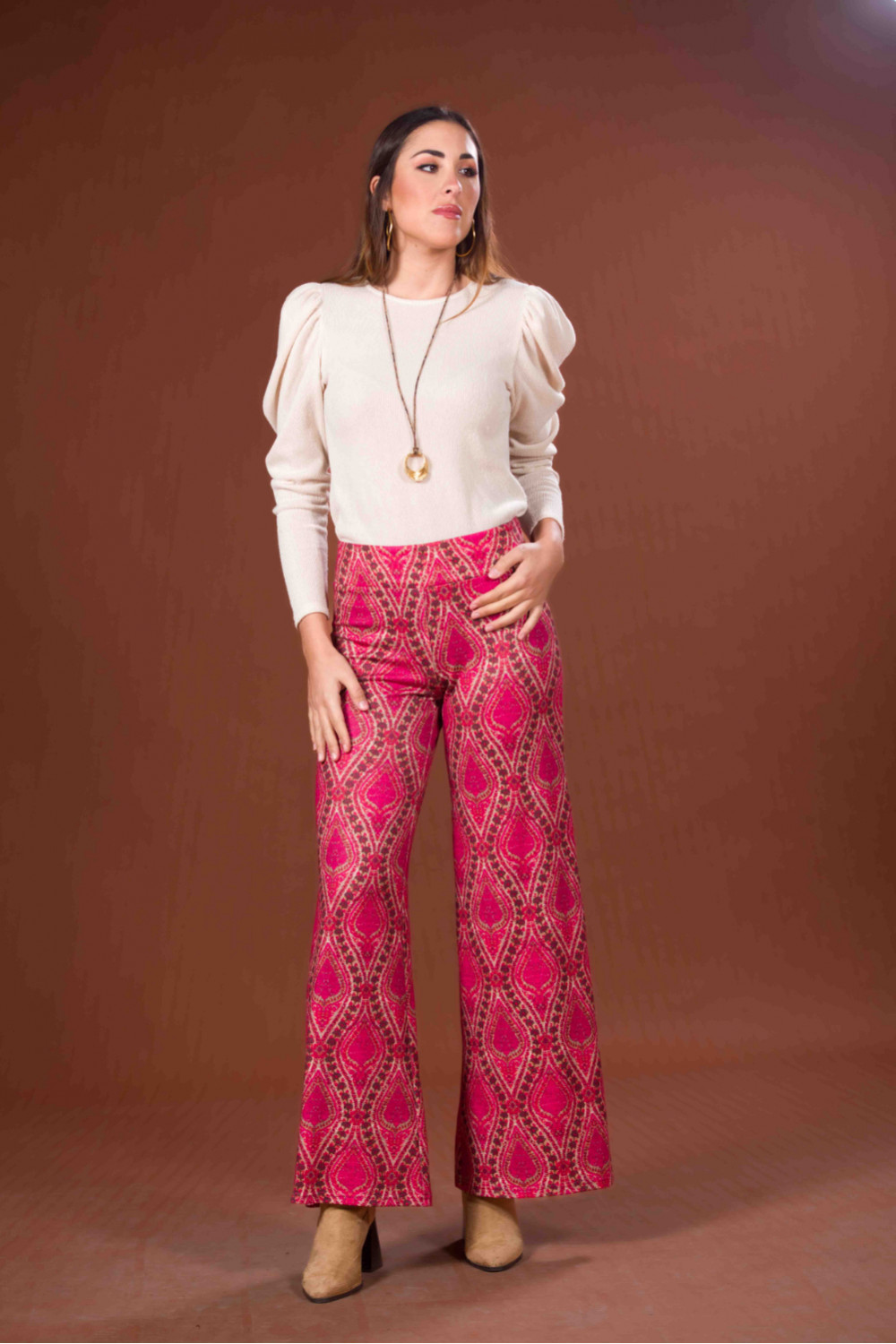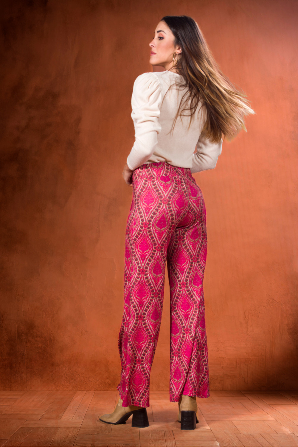 Pantalón atenea de punto jersey fucsia de pata ancha con estampado haciendo cadenetas en tono fucsia acabado ligero.