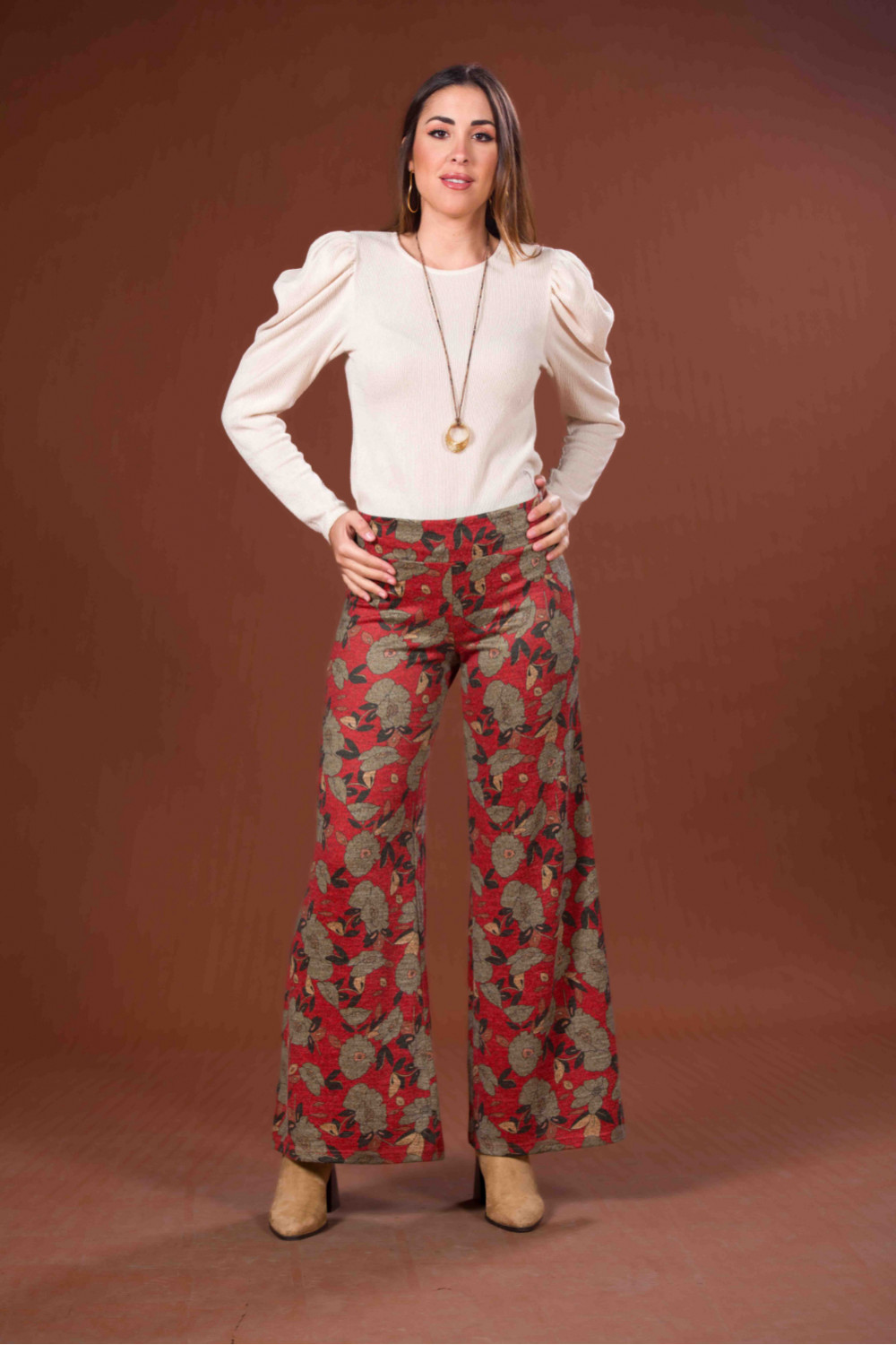 Pantalón atenea de punto jersey cazuela de pata ancha con estampado naranja con flores tierra acabado ligero.