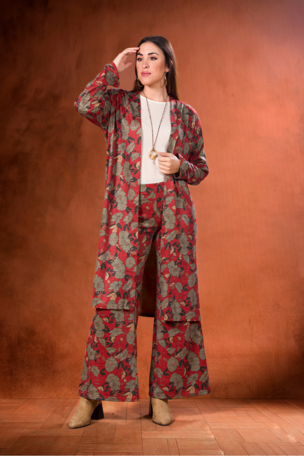 Chaqueta atenea de punto jersey larga con estampado naranja con flores tierra acabado ligero lleva dos aperturas laterales con botones japo al tono.COMPOSICIÓN: 95% POLIESTER, 5% LICRA